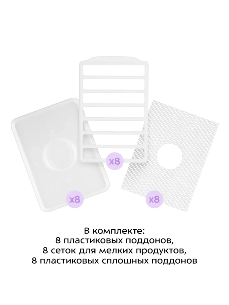 В комплекте идут 8 пластиковых поддонов, 8 сплошных поддонов, 8 сеток и поддон для подвешивания.