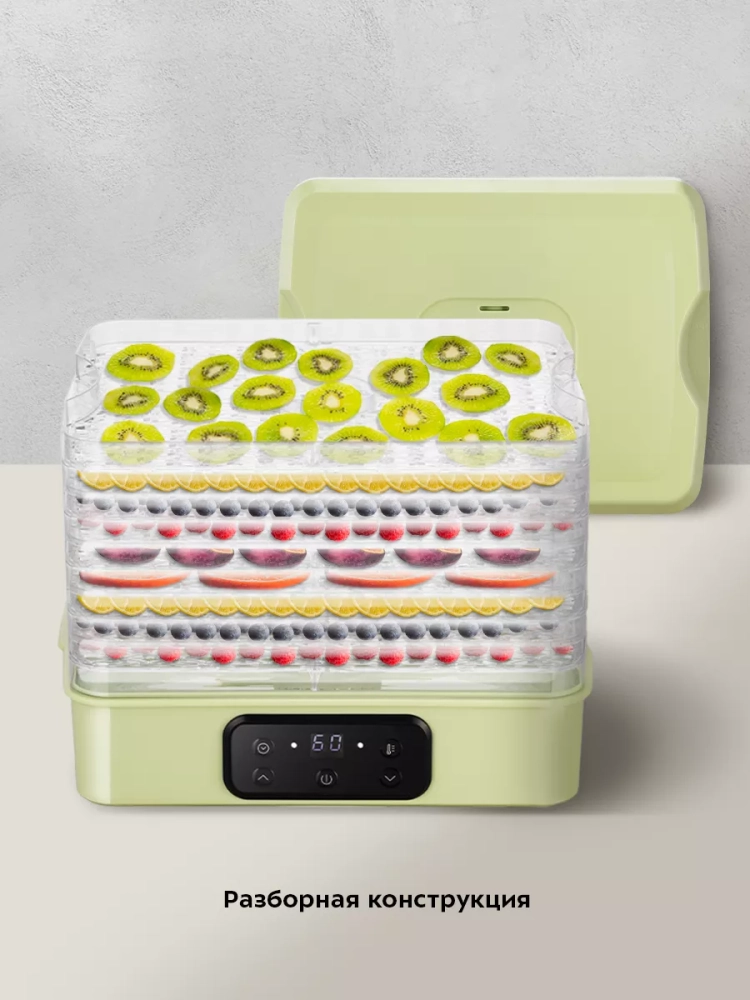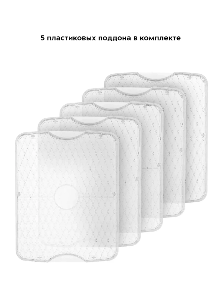 Сушилка имеет в комплекте 5 поддонов из пластика и крышку.