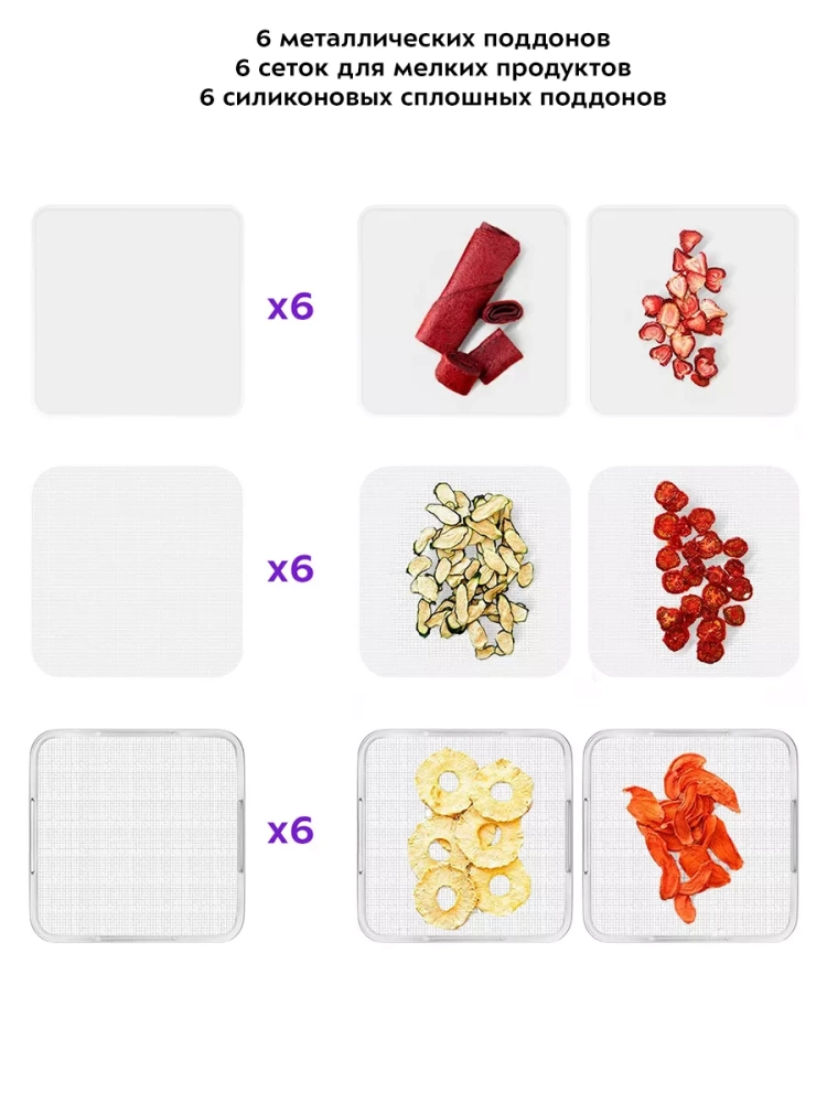 Сушилка имеет в комплекте 6 металлических поддонов, 6 сеток для мелких продуктов и 6 силиконовых сплошных поддонов. Также в комплект входит 1 поддон для жидкости, который облегчает очистку устройства: на поддон попадают остатки от продуктов и сок, после чего поддон легко достать и очистить, а дно камеры сушилки остается чистым.