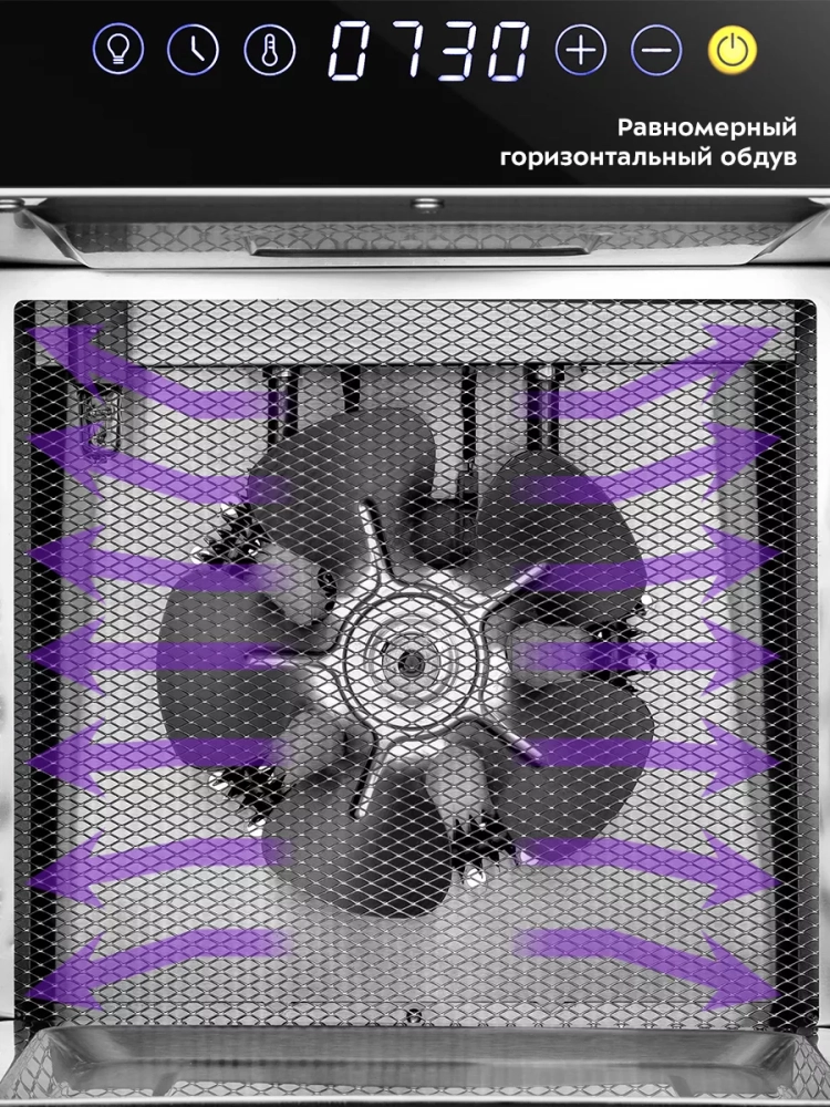 В сушилку установлен мощный нагревательный элемент и вентилятор, обеспечивающий равномерное распределение нагретого воздуха по всему объему камеры. Благодаря горизонтальному обдуву смешение запахов при одновременной сушке разных продуктов минимально.