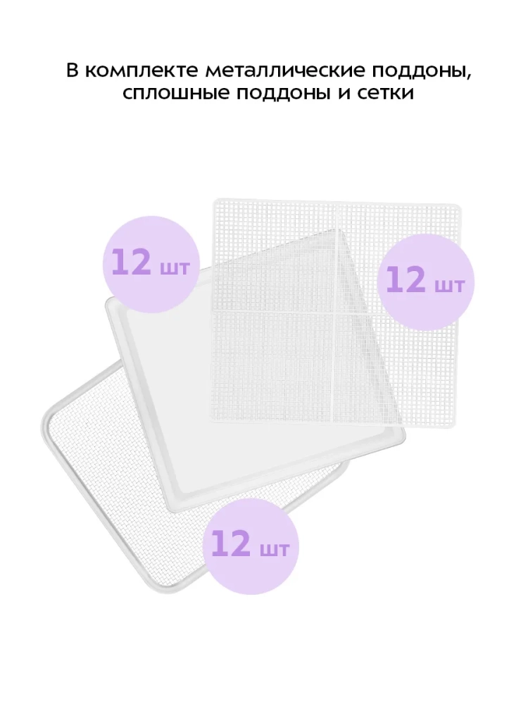 Сушилка имеет две независимые камеры, в каждую из которых может быть установлено по 6 металлических поддонов. В комплект входит 12 металлических поддонов, 12 сплошных пластиковых поддонов и 12 сеток.