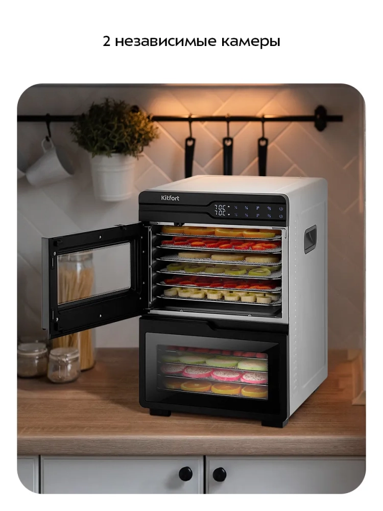 Электрическая сушилка для овощей и фруктов Kitfort КТ-4975 предназначена для сушки овощей, фруктов, ягод, грибов, корнеплодов, трав и зелени, а также мяса и рыбы, хлеба.