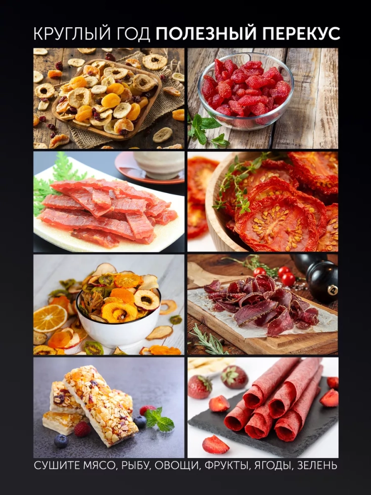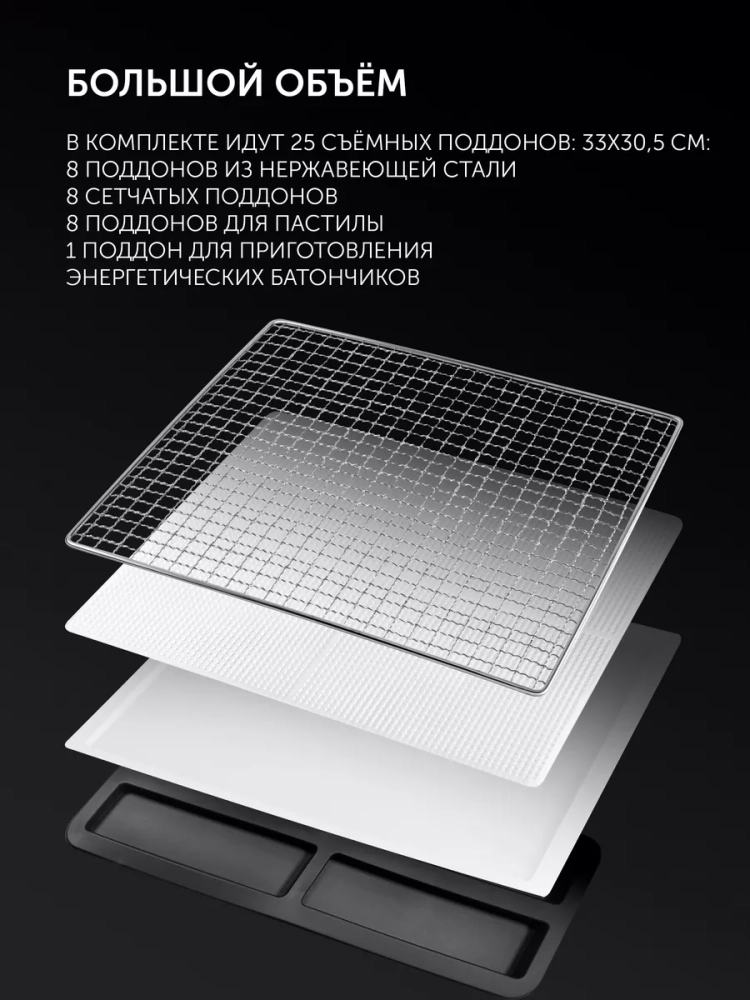 С мощностью 700 Вт и 25 поддонами различной конфигурации, вы сможете готовить сушеное манго без сахара, клубнику, зелень, грибы, рыбу, мясо и даже пастилу и фруктовые чипсы. В комплект входят 8 поддонов из нержавеющей стали для сушки более твердых продуктов, 8 гибких сетчатых листов для нежной сушки, 8 гибких поддонов для пастилы, а также специальный поддон для приготовления энергетических батончиков.