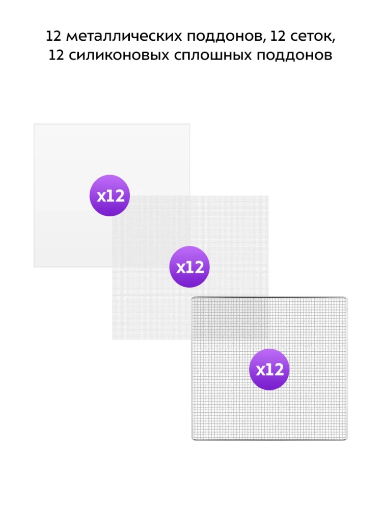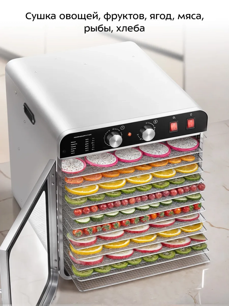 В комплекте есть 12 металлических поддонов, 12 силиконовых сплошных поддонов и 12 сеток. Температуру сушки можно изменить от 30 до 90 °С. Сушилка оснащена таймером до 12 часов. Внутри камеры можно включить подсветку.