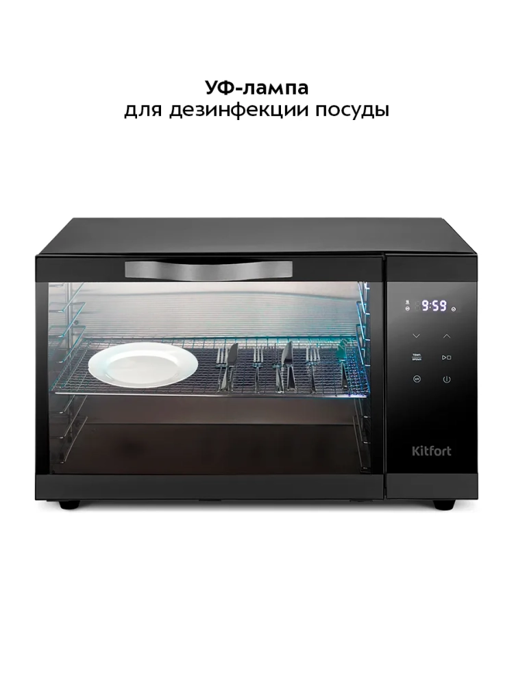 Особенностью данной модели является встроенная УФ-лампа с длиной волны UV-C, которая обеспечивает дезинфекцию посуды и продуктов. Ультрафиолетовое излучение эффективно уничтожает микроорганизмы, что делает сушилку не только функциональной, но и безопасной для использования на кухне.