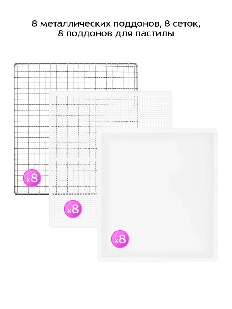 Электрическая сушилка для овощей и фруктов мощностью 620 Вт — это незаменимая техника для вашей кухни. Она предназначена для эффективной сушки овощей, фруктов, ягод, грибов, корнеплодов, трав и зелени, а также мяса и рыбы. В комплект входят 8 поддонов из нержавеющей стали, 8 сеток и 8 поддонов для пастилы, что позволяет готовить разнообразные снеки и пастилы.