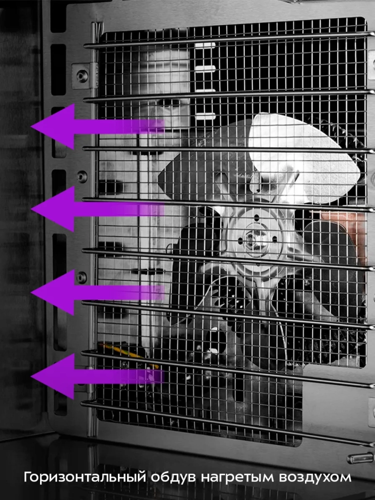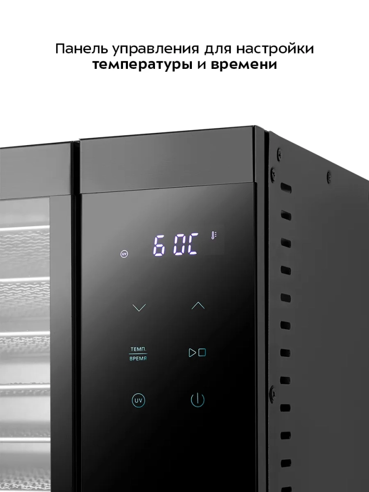 Эта электросушилка оснащена мощным нагревательным элементом и вентилятором, обеспечивающим равномерное распределение нагретого воздуха. Благодаря горизонтальному обдуву, смешение запахов при сушке различных продуктов минимально. Температура сушки регулируется в диапазоне 30–70 °С с шагом 1 °С, что позволяет точно настроить процесс для каждого типа продуктов. Таймер сушки можно установить в диапазоне от 1 до 24 часов с шагом 5 минут, что делает процесс сушки удобным и контролируемым.