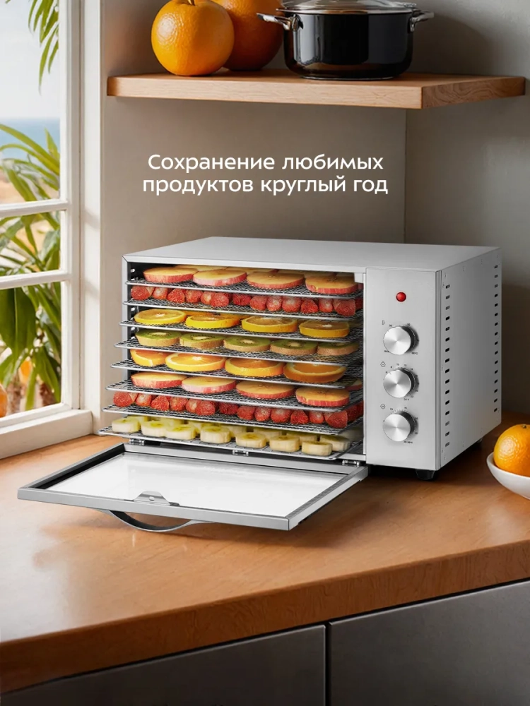Электросушилка идеально подходит для приготовления пастилы, сушеных овощей и фруктов, а также для создания домашних снеков. Благодаря встроенному таймеру, вы можете точно контролировать процесс сушки, что особенно важно для сохранения вкусовых качеств продуктов. Дегидратор также может использоваться для сушки рыбы и зелени, что делает его универсальным решением для кухни.