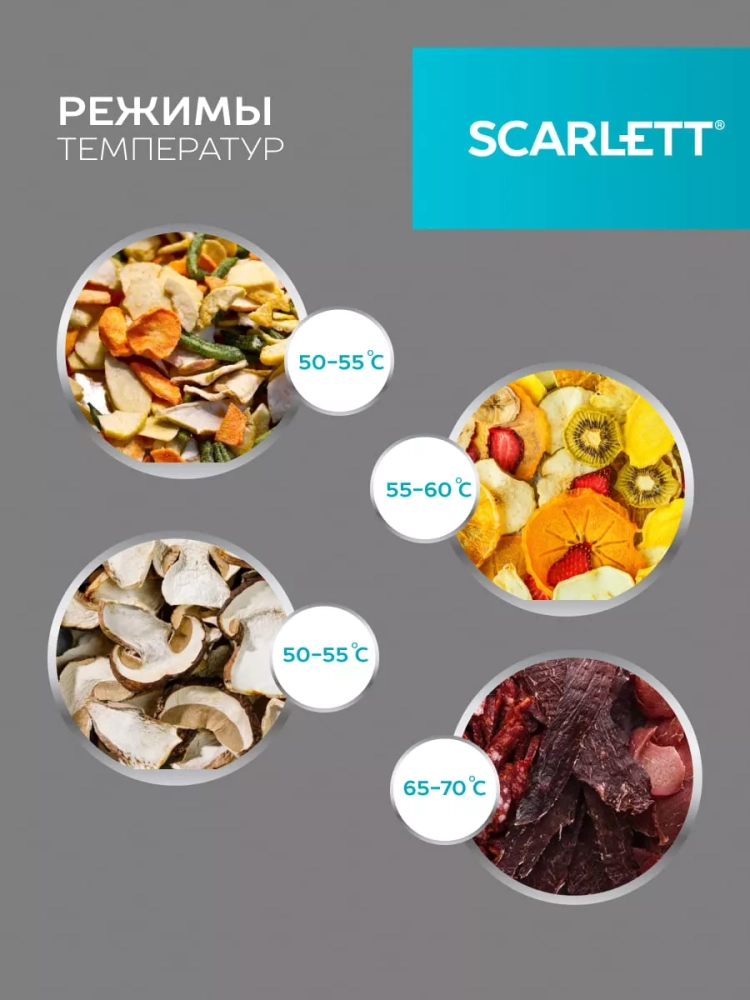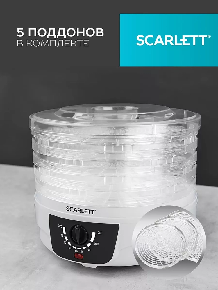 Предназначена для сушки овощей, фруктов, грибов, трав и ягод в домашних условияхМожет использоватьcя для приготовления пастилы и вяленого мяса5 поддонов с регулируемой высотой для сушки продуктовМаксимальная загрузка каждого поддона до 1 кгРегулируемая температура: от 40 до 70 СКонвекция - встроенный вентилятор обеспечивает равномерную сушку продуктовОдинаковая температура на всех уровнях благодаря встроенному вентиляторуСветовой индикатор работыРецепты и рекомендации по сушке разных видов продуктов в инструкции.