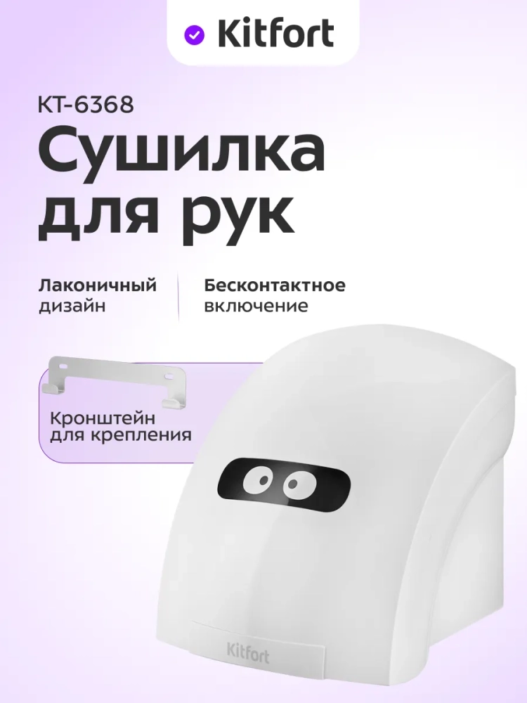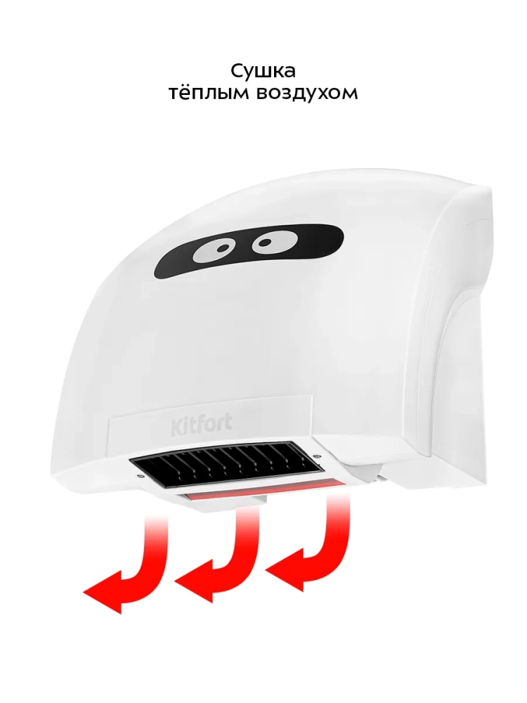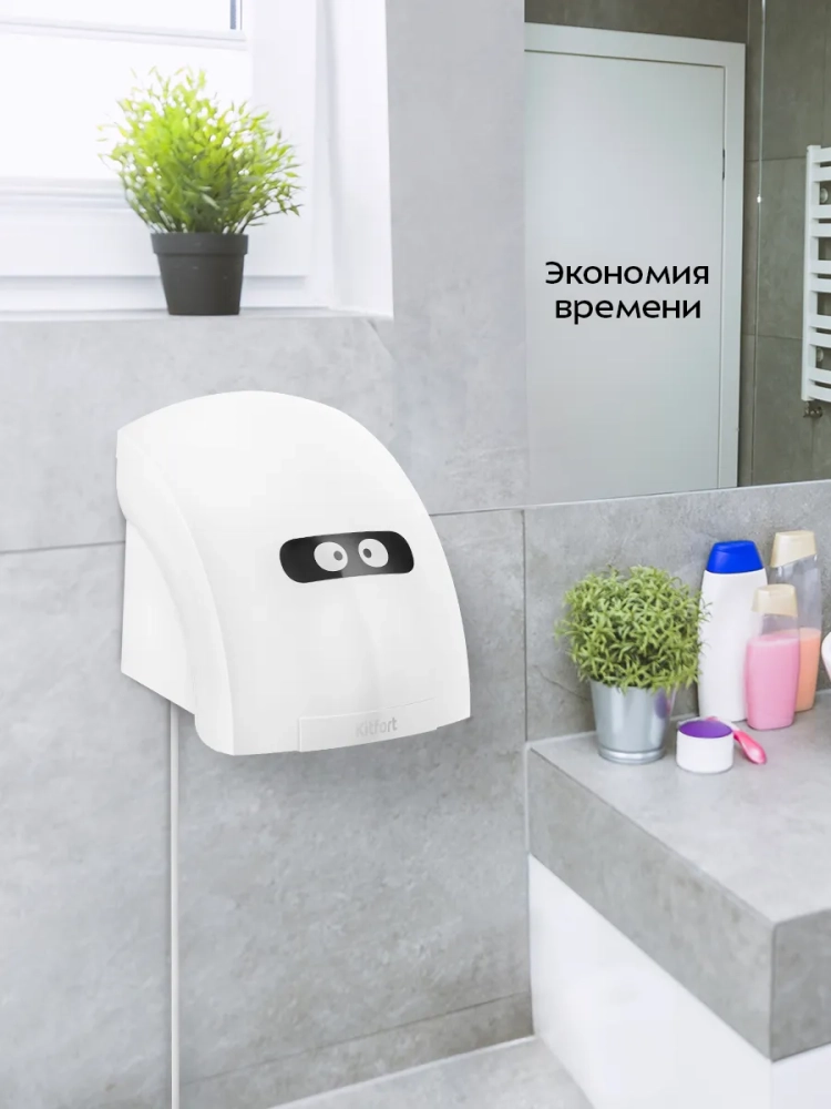 Сушилка для рук Kitfort КТ-6368 сушит руки потоком теплого воздуха. Принцип работы схож с феном для волос: вентилятор выдувает воздух, он проходит через нагревательный элемент и подается на руки. При использовании сушилки для рук вам не придется постоянно покупать и менять одноразовые бумажные полотенца для рук или регулярно стирать многоразовые полотенца. К тому же сушилка для рук — более гигиеничный способ высушить руки, так как срабатывает автоматически без необходимости дотрагиваться руками. Инфракрасный датчик движения включает сушилку, когда вы подносите руки, и выключает, когда вы убираете руки от датчика. Для защиты от перегрева сушилка отключается через 1 минуту непрерывной работы. Также в корпусе установлен термостат, который распознает перегрев устройства и отключит его до тех пор, пока сушилка не остынет до нормальной рабочей температуры.