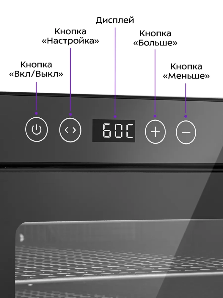 Прибор позволяет установить температуру сушки от 35 до 70 °С с шагом 1 °С и время сушки от 30 минут до 48 часов с шагом 30 минут. Время и температура отображаются на дисплее.