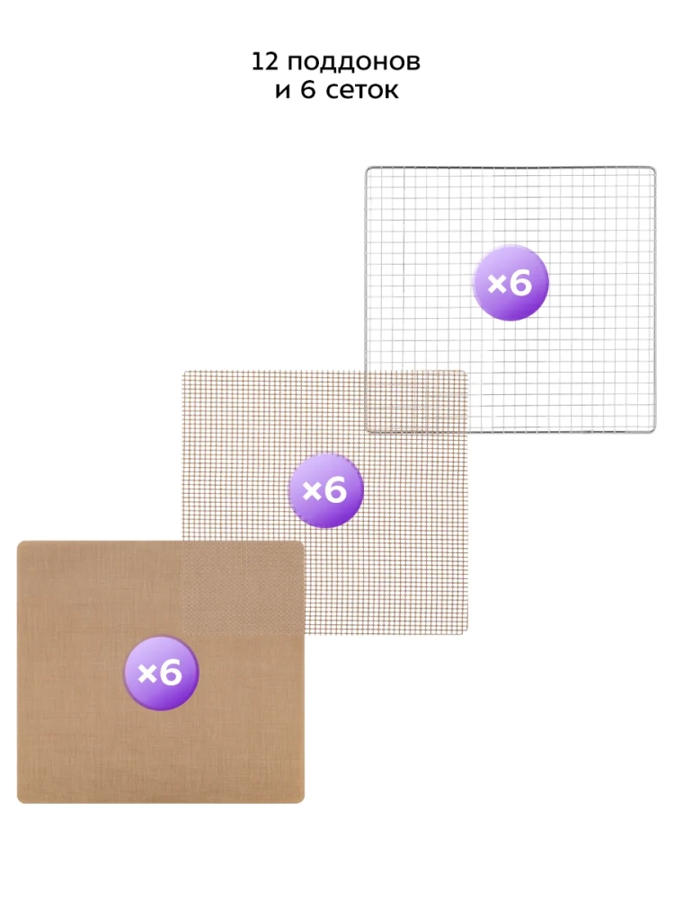 В комплект сушилки входят 6 металлических поддонов, 6 сплошных пластиковых поддонов и 6 сеток для сушки мелких продуктов.