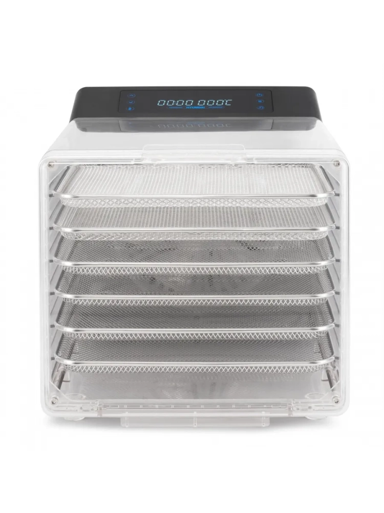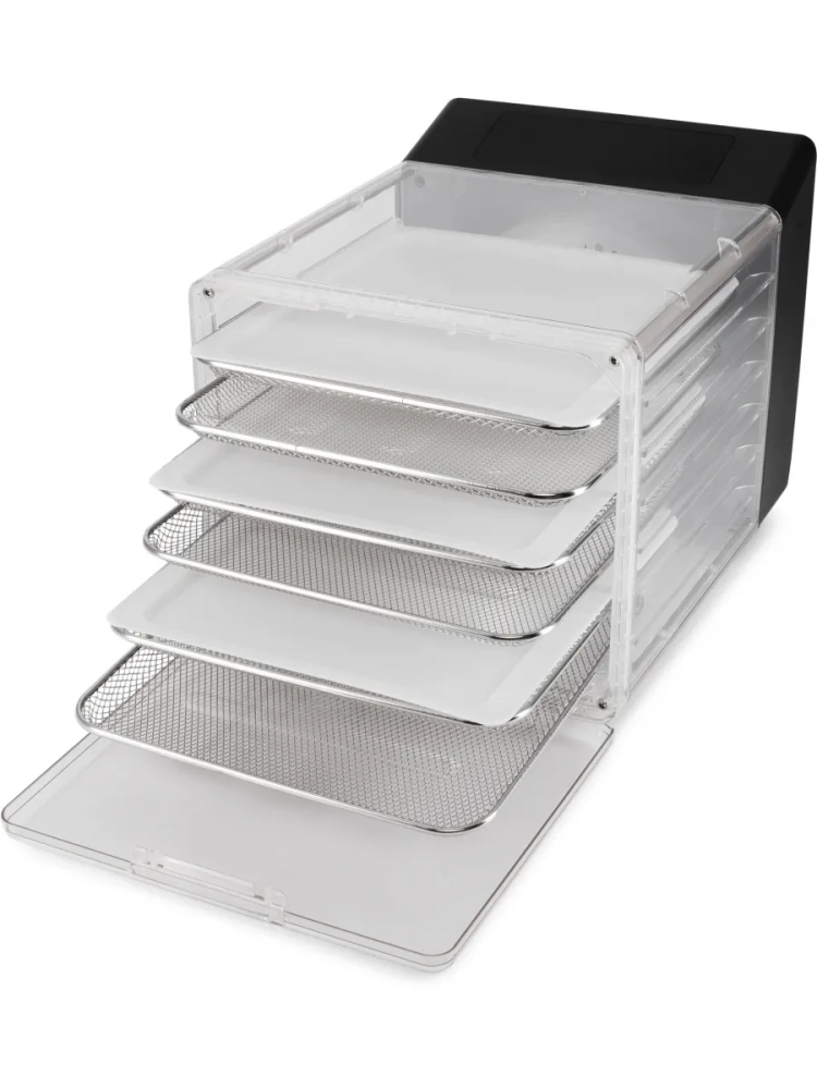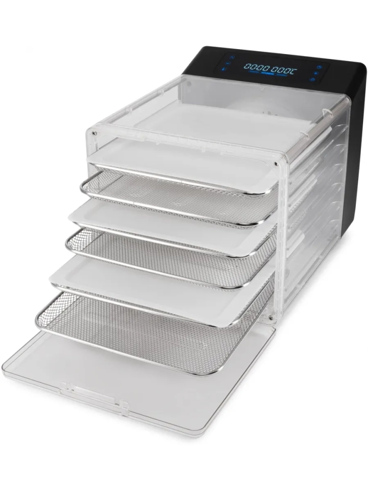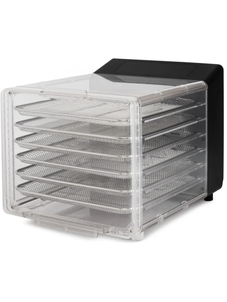 Предлагает 6 уровней сушки с 12 поддонами (6 металлических для сушки и еще 6 для приготовления пастилы), что позволяет обрабатывать достаточно большое количество продуктов одновременно. Широкий диапазон регулировки температуры от 30°C до 75°C дает возможность точно настроить режим сушки для различных видов продуктов, гарантируя сохранение их питательных свойств и природного вкуса. Прекрасно подходит и для вяления мяса и рыбы, расширяя ваши кулинарные возможности.