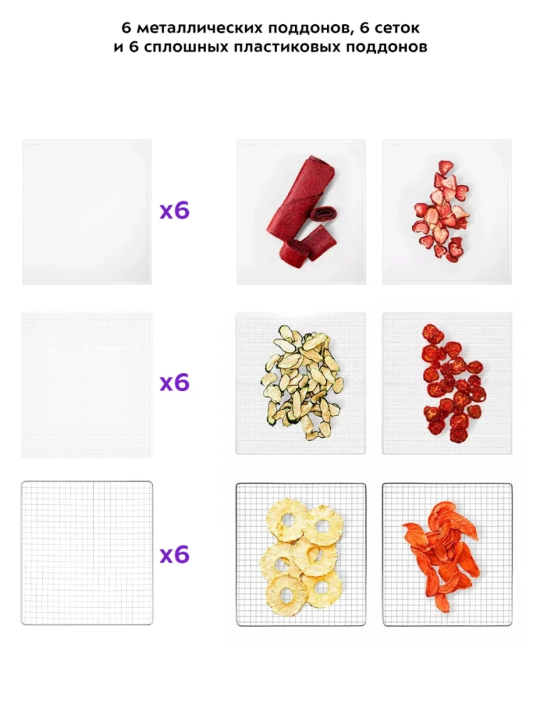 Сушилка оснащена несколькими поддонами, что позволяет одновременно обрабатывать значительное количество фруктов и овощей. Поддоны выполнены из прочного материала и имеют мелкую металлическую сетку, что предотвращает падение мелких кусочков продуктов. Электросушилка Kitfort идеально подходит для приготовления пастилы, сушеной зелени, рыбки и даже хлеба. Благодаря этому устройству, вы сможете разнообразить свой рацион и приготовить полезные закуски для всей семьи.