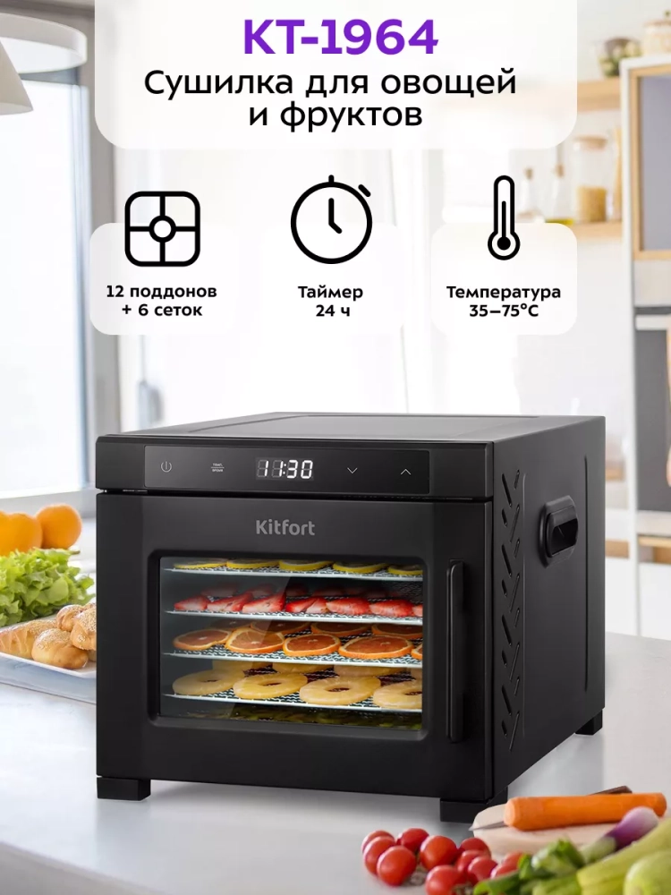 Эта кухонная техника отличается простотой в использовании и уходе. Черный корпус сушилки гармонично впишется в интерьер любой кухни, а компактные размеры позволят разместить её даже в небольших пространствах. Электрическая сушилка Kitfort — это не просто предметы для готовки, а настоящая находка для тех, кто ценит качество и удобство.