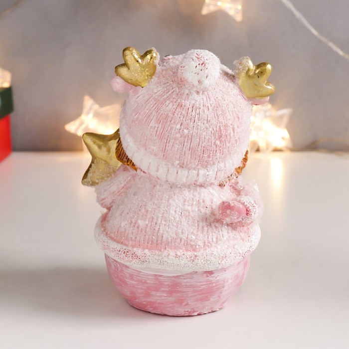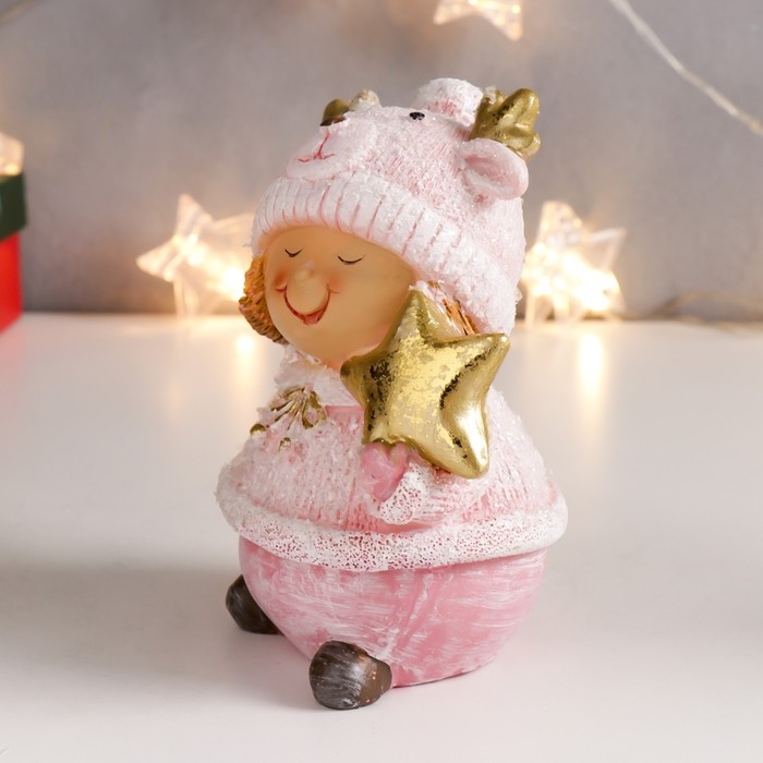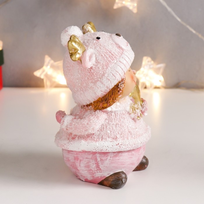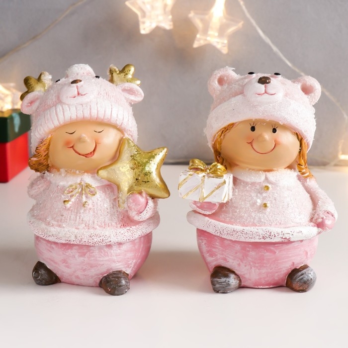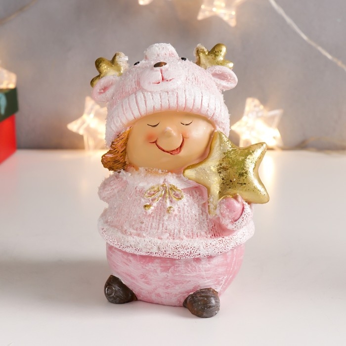 Сувенир полистоун "Малышка-пухляшка в розовом, в шапке мишки, с подарком" 13х9,5х7 см