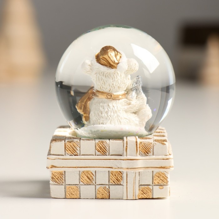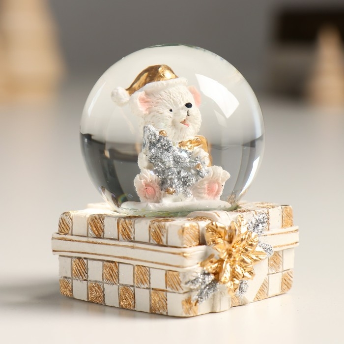 Сувенир полистоун водяной шар "Белый миша с ёлочкой в подарке" золото/серебро 4,5х4,5х6,5 см