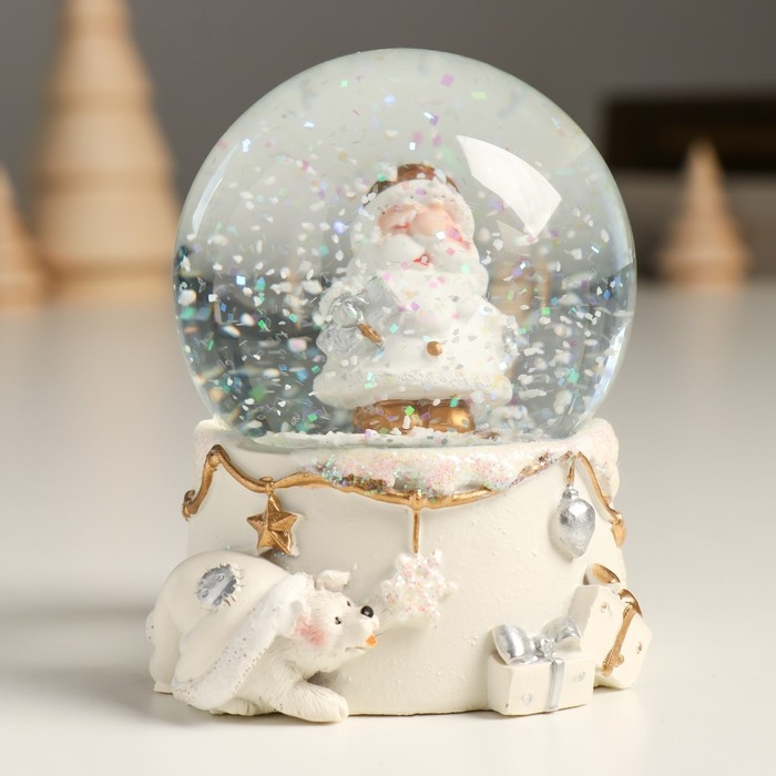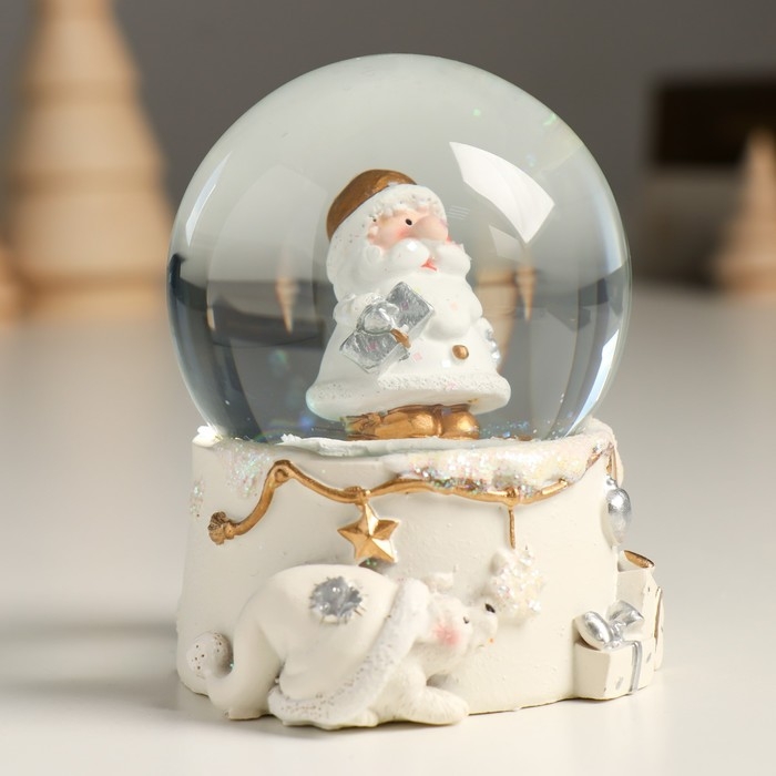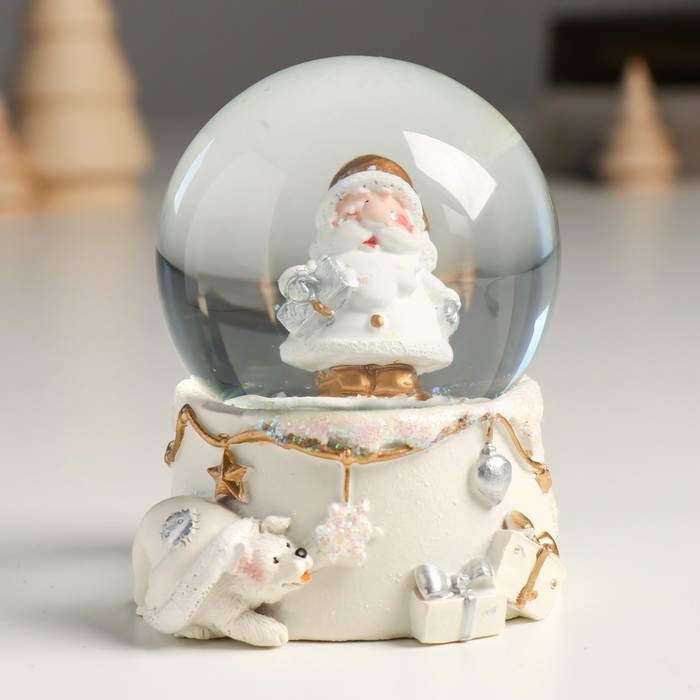 Сувенир полистоун водяной шар "Дед Мороз с подарком" белый с золотом 7х8х9 см
