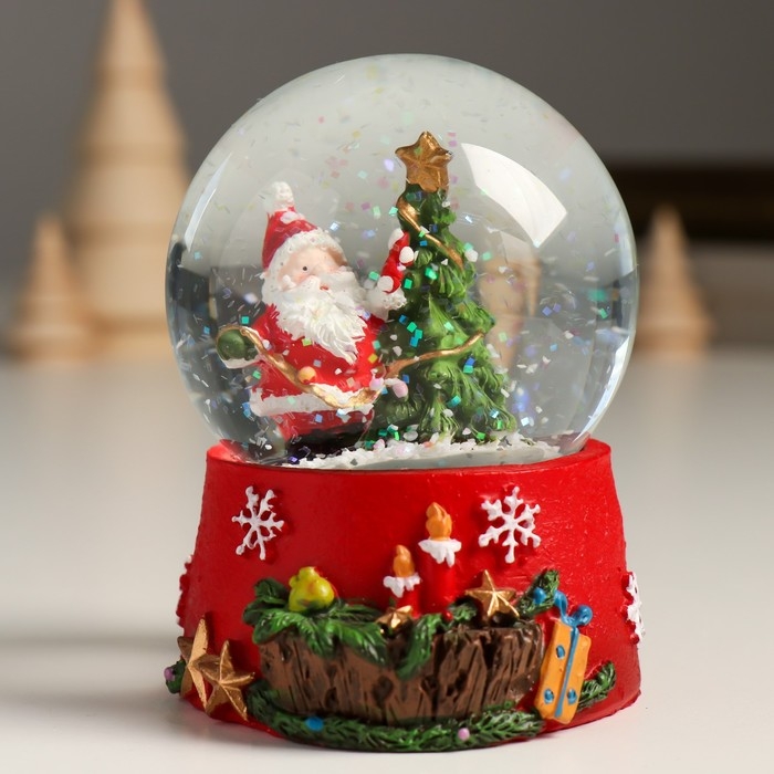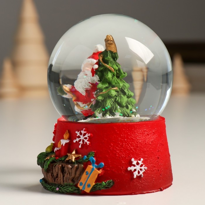 Сувенир полистоун водяной шар "Дедушка Мороз вешает гирлянду на ель" 7х8х9 см