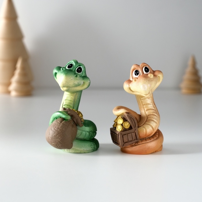 Сувенир полистоун "Змейка с сундуком/мешком" МИКС 3,5х3,5х6,5 см