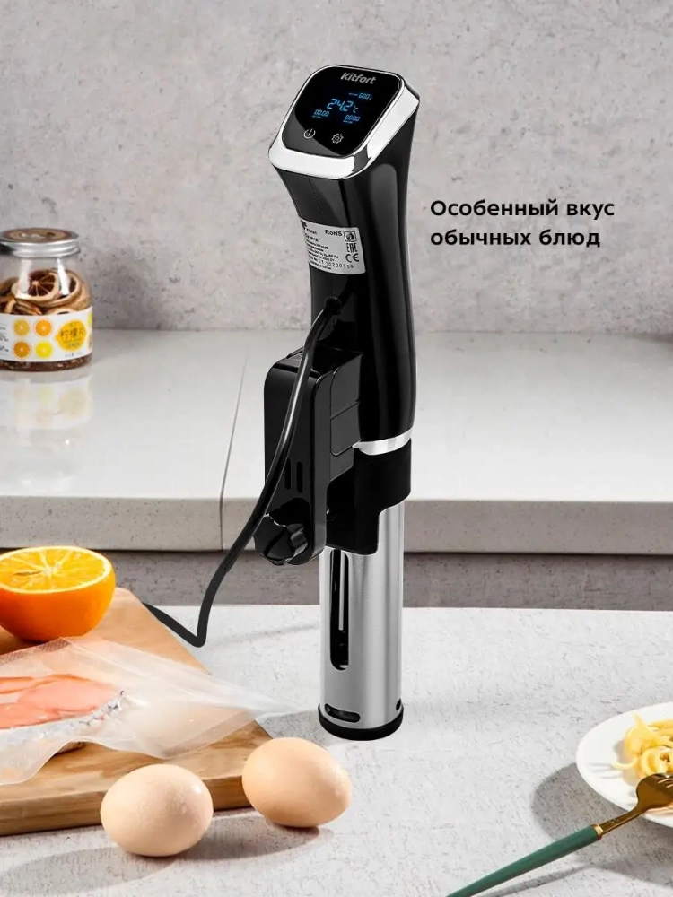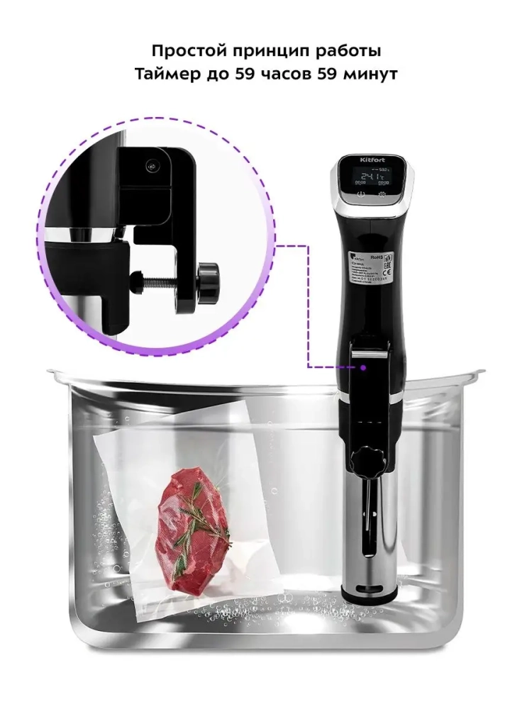 Погружной су-вид Kitfort КТ-4059 предназначен для приготовления пищи в вакуумных герметичных пакетах, помещенных в чашу с водой.