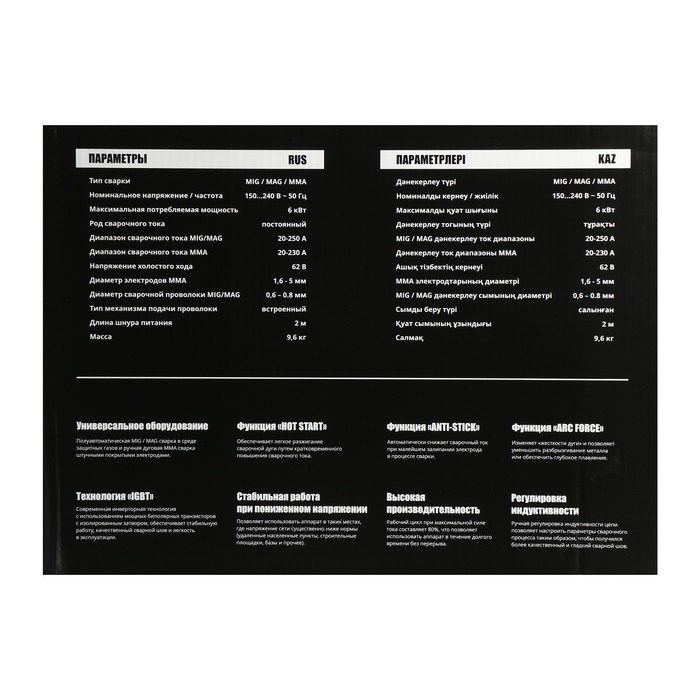 Сварочный инвертор Kolner KMIG 250, полуавтомат, 6 кВт, 20-250 А, MIG / MAG / ММА, ПН 80%