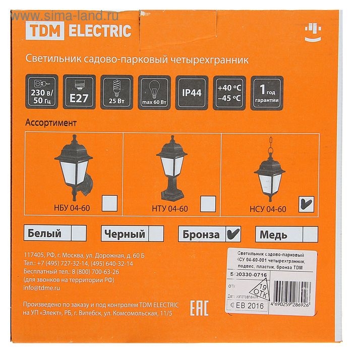 Светильник садово-парковый, TDM НСУ 04-60-001, E27,60Вт,IP44,четырёхгр.,подвес., цвет бронза