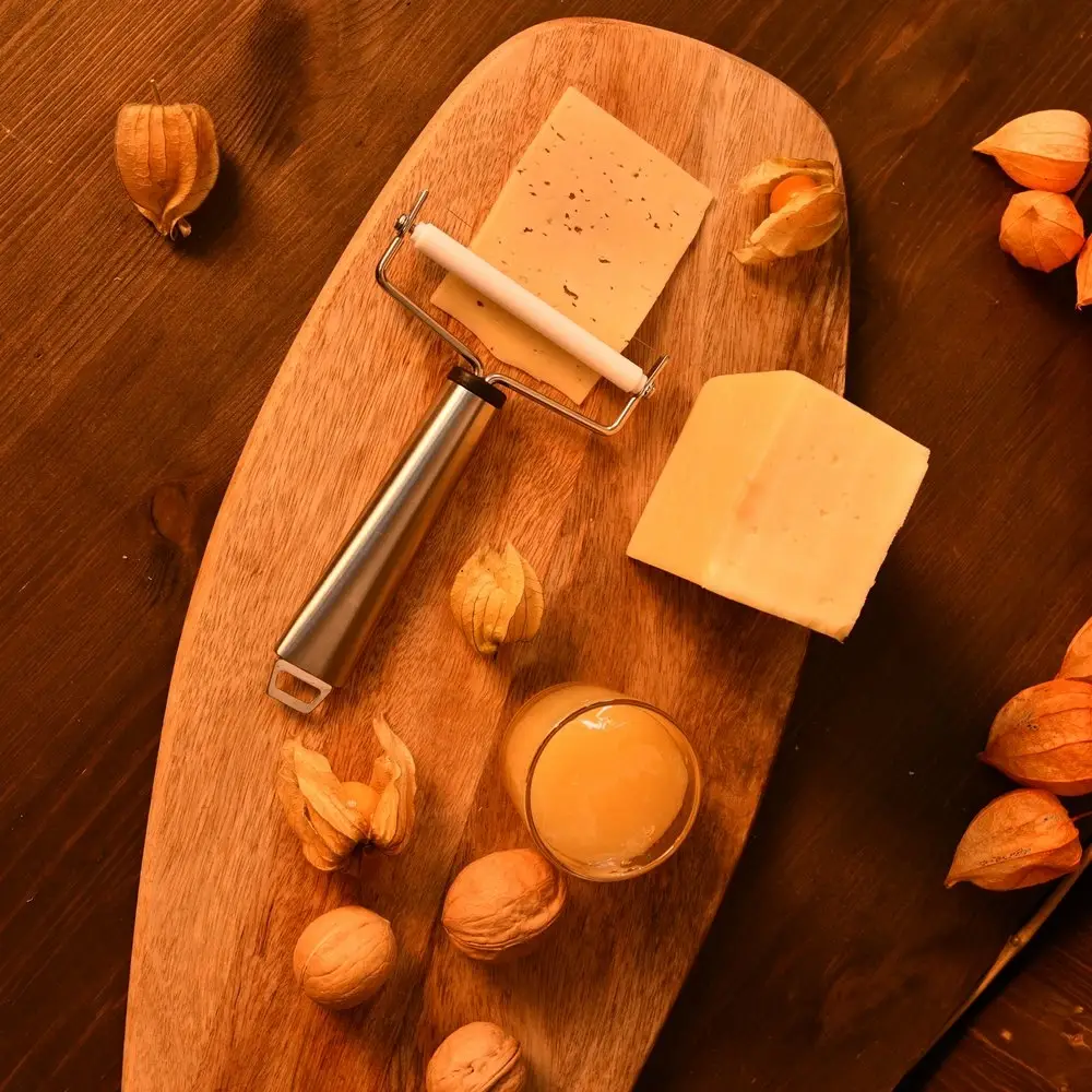Со струнной сырорезкой гораздо проще приготовить бутерброды и закуски – ломтики получаются аккуратными, одинаковыми по толщине. Рабочая часть состоит из ролика и струны. Ролик плавно перемещается по кусочку сыра, делая нарезку струной проще и легче. Струнная сырорезка безопасна, поскольку не имеет остро заточенных лезвий. Изготовлено: ручка и струна из коррозионностойкой (нержавеющей) стали, ролик из пластмассы (ABS). Размер 14,5х11см.