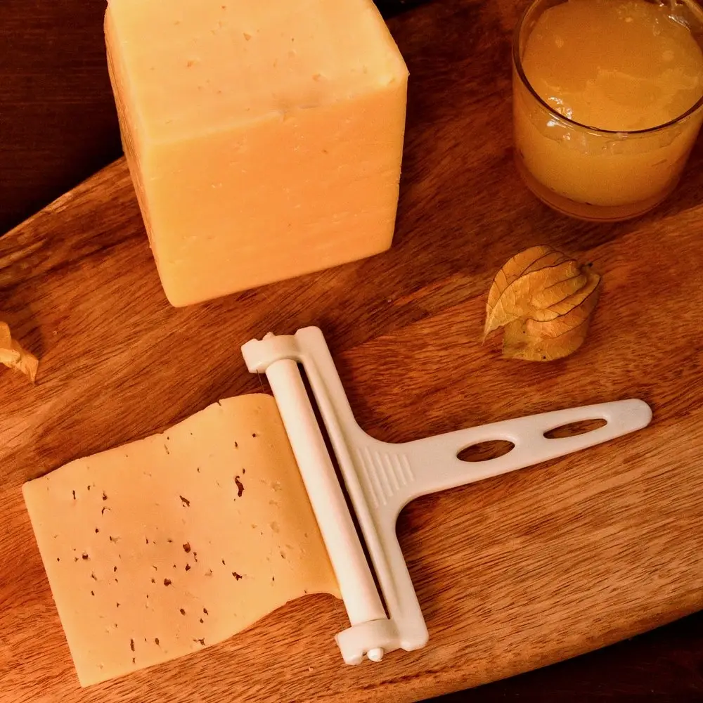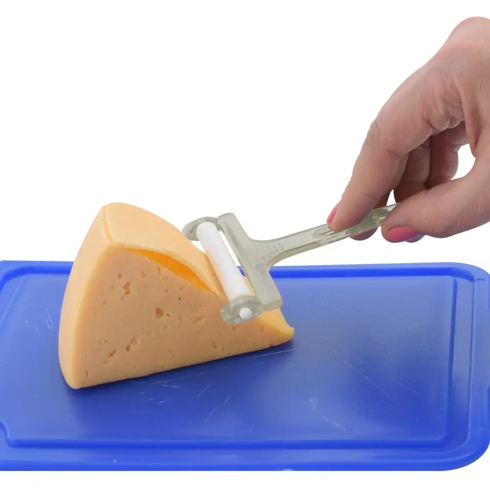 Рабочая часть состоит из ролика и струны. Ролик плавно перемещается по кусочку сыра, делая нарезку струной проще и легче. Пластмассовая ручка имеет рельефную поверхность для удобства захвата.
