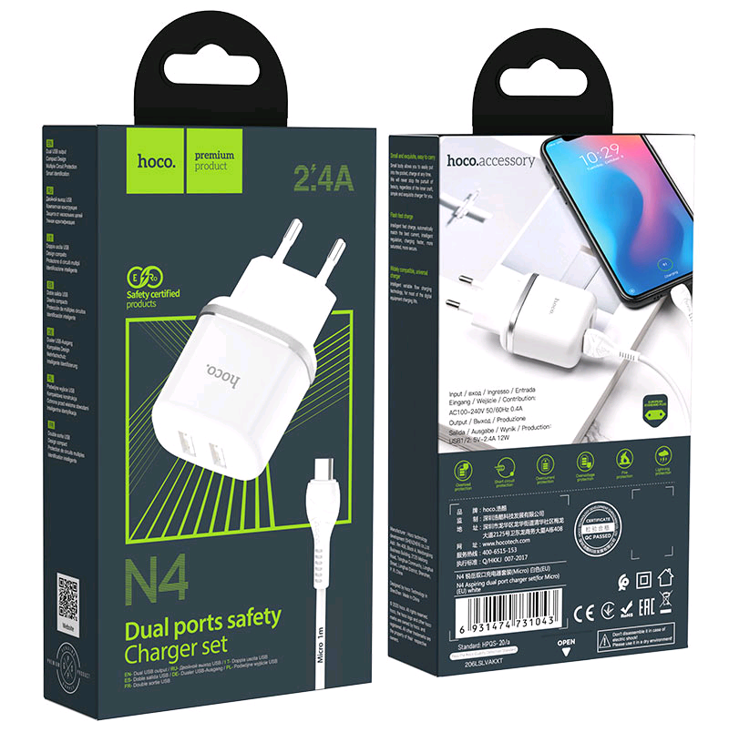 СЗУ N4 USB на Micro USB + 2 USB 2.4A HOCO белое