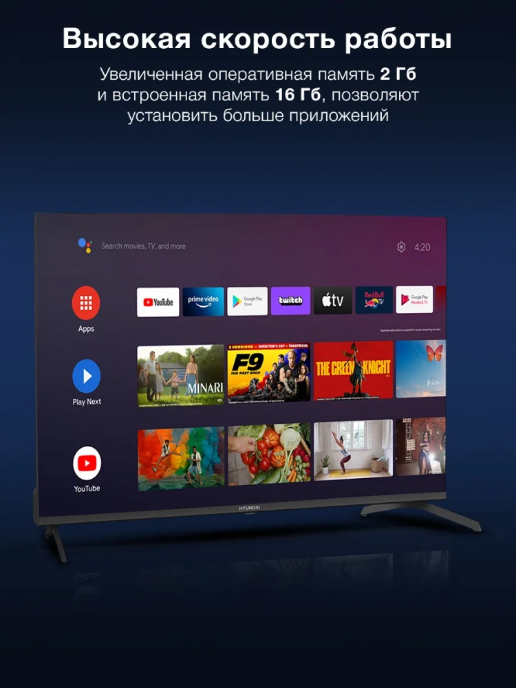 Модель оснащена голосовым ассистентом, который поможет вам управлять телевизором голосом. С помощью ассистента вы сможете искать фильмы, устанавливать напоминания, задавать вопросы и многое другое.