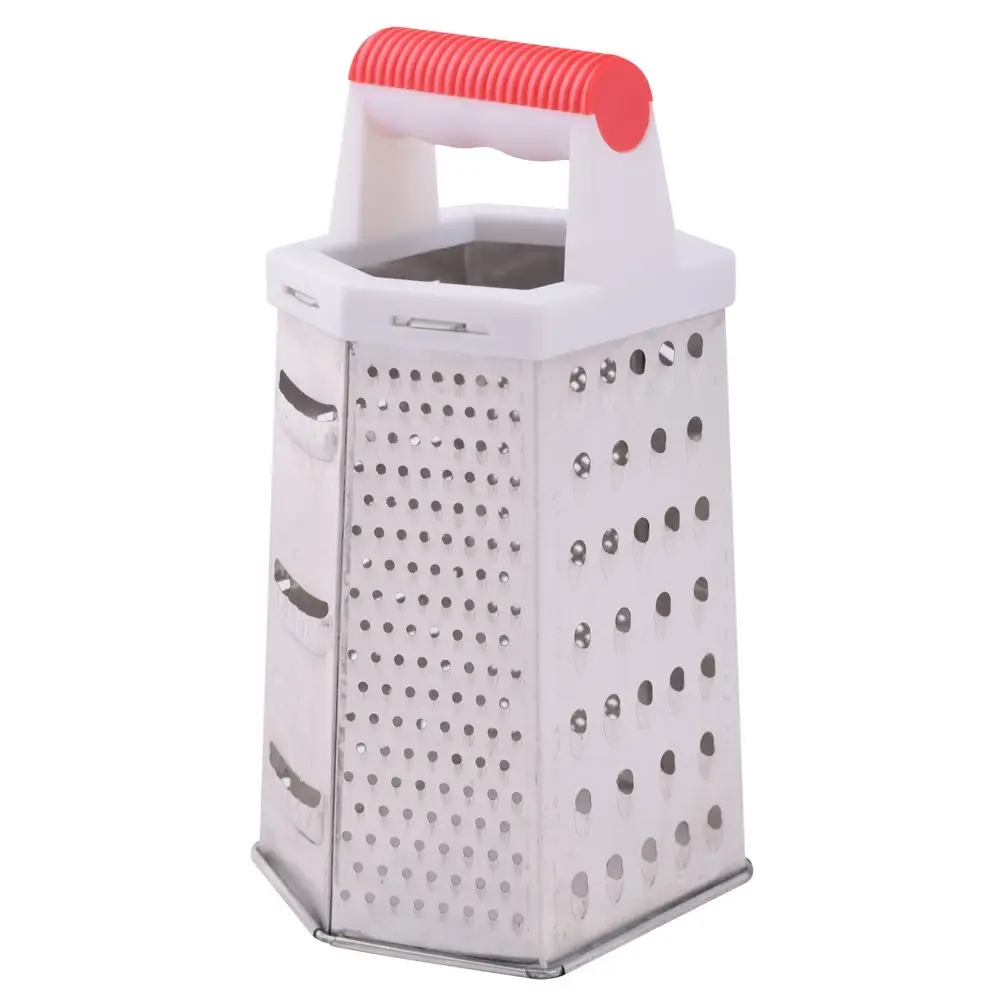 Для приготовления горячих блюд, салатов, закусок, украшения выпечки и кондитерских изделий очень часто нужно измельчить ингредиенты. Шестигранная терка – удобное кухонное приспособление с отверстиями и насечками шести типов: мелкая и средняя терки, крупная терка, шинковка, фигурная шинковка и шредер. Пользоваться изделием легко: поставьте терку на стол, одной рукой держите за ручку. Второй рукой возьмите продукт, прижмите к нужной вам грани и начинайте тереть, направляя движения вниз. Натирайте только крупные части, чтобы не повредить пальцы. Рабочая поверхность выполнена из коррозионностойкой стали, ручка – из пластмассы, высота изделия 22 см. Уход за изделием прост: после использования промывайте водой, удаляя щеткой остатки пищи.