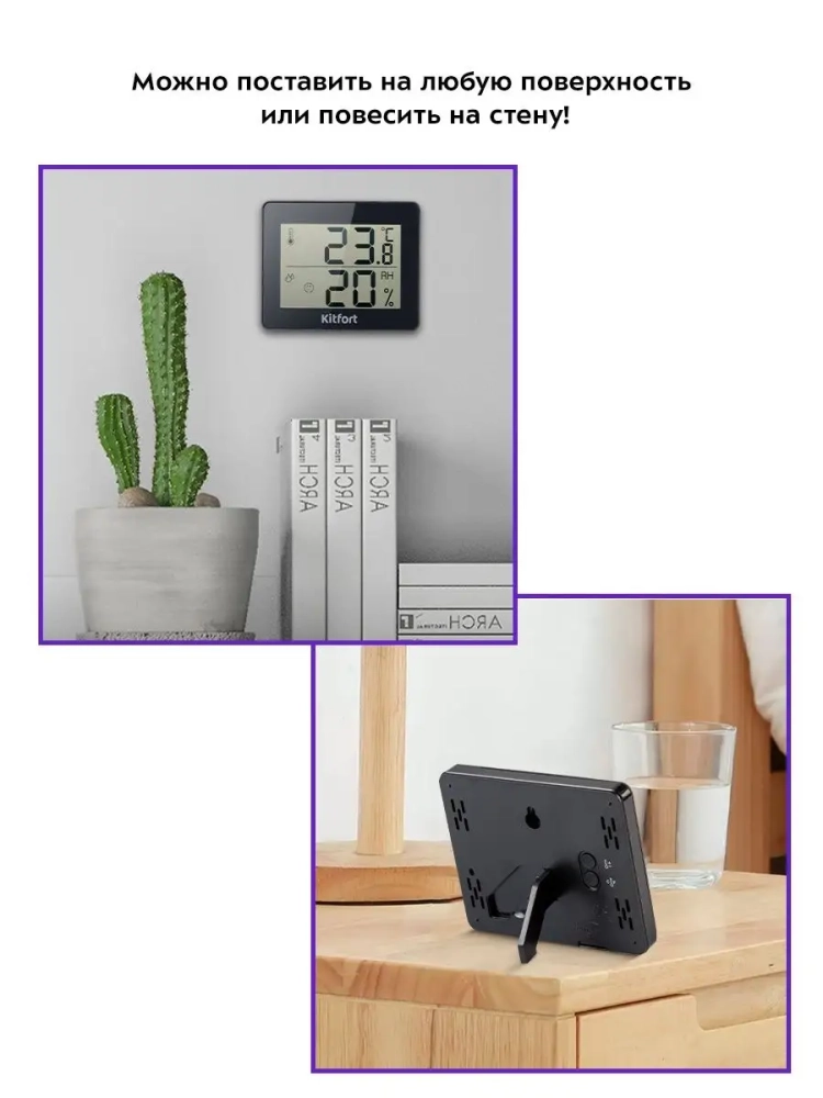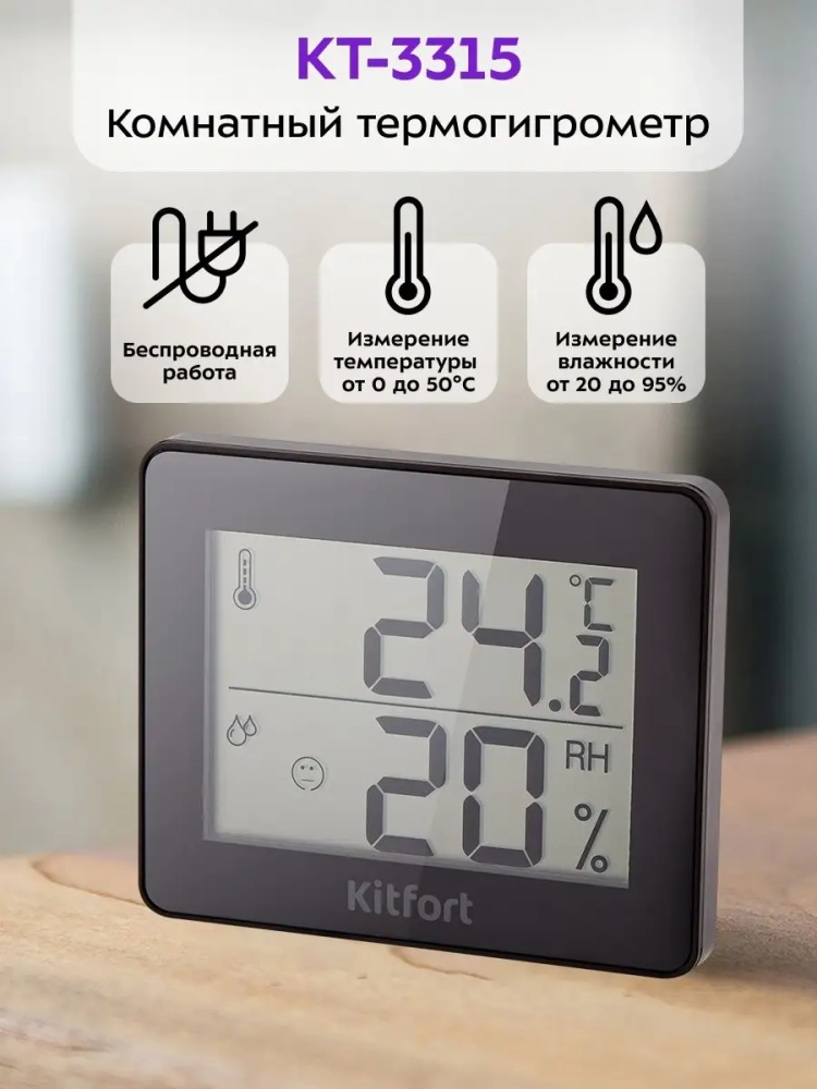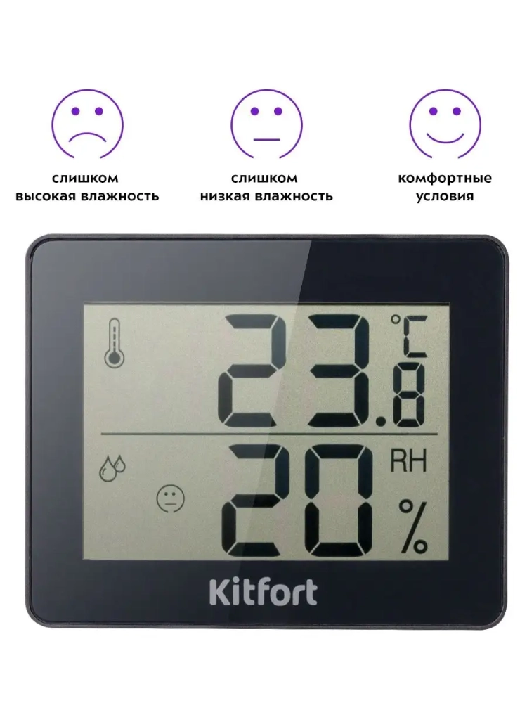 Комнатный термогигрометр Kitfort KT-3315 — устройство, позволяющее следить за изменениями температуры и влажности в помещении. Комнатный термогигрометр показывает текущие температуру и влажность в помещении, а также их максимальные и минимальные значения за последний час. На дисплее помимо температуры и влажности отображается индикатор комфорта. Комфортный микроклимат в помещении очень важен для человека, так как влияет на самочувствие, настроение и работоспособность. Благодаря компактному размеру и стильному дизайну термогигрометр легко впишется в ваш интерьер. Комнатный термогигрометр работает от 1 батарейки типа CR2025. Благодаря питанию от батарейки у устройства отсутствуют провода, поэтому его можно установить в любое удобное место или повесить на стену. Также при низком уровне заряда батарейки на дисплее появляется соответствующий значок, что позволяет вам вовремя заменить батарейку.