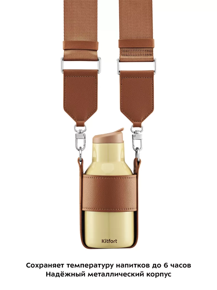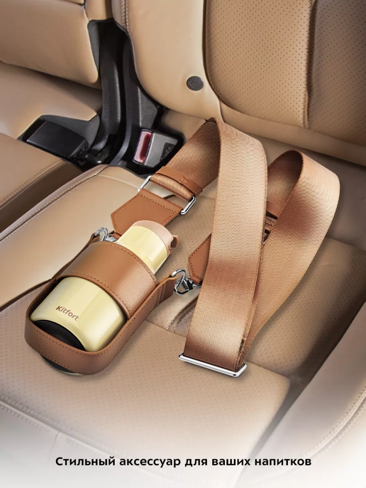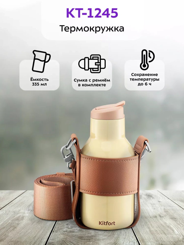 Термокружка Kitfort КТ-1245 предназначена для сохранения температуры напитков. Она может поддерживать температуру содержимого в течение примерно 6 часов. Для удобной переноски термокружки в комплекте предусмотрена кожаная сумка с ремнем.