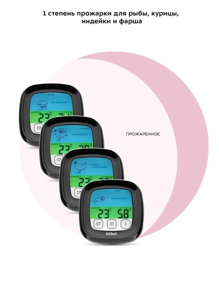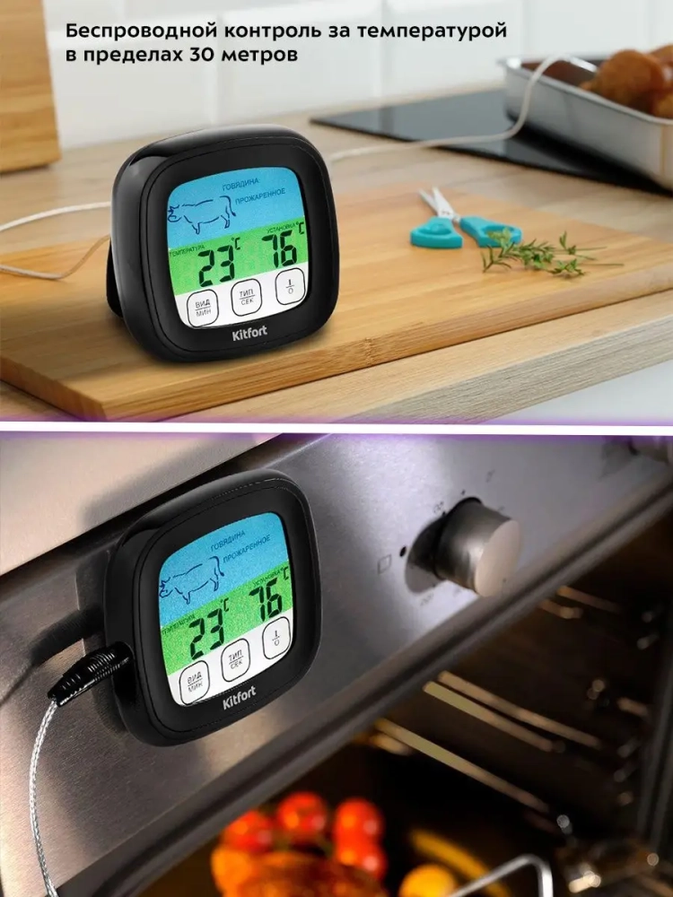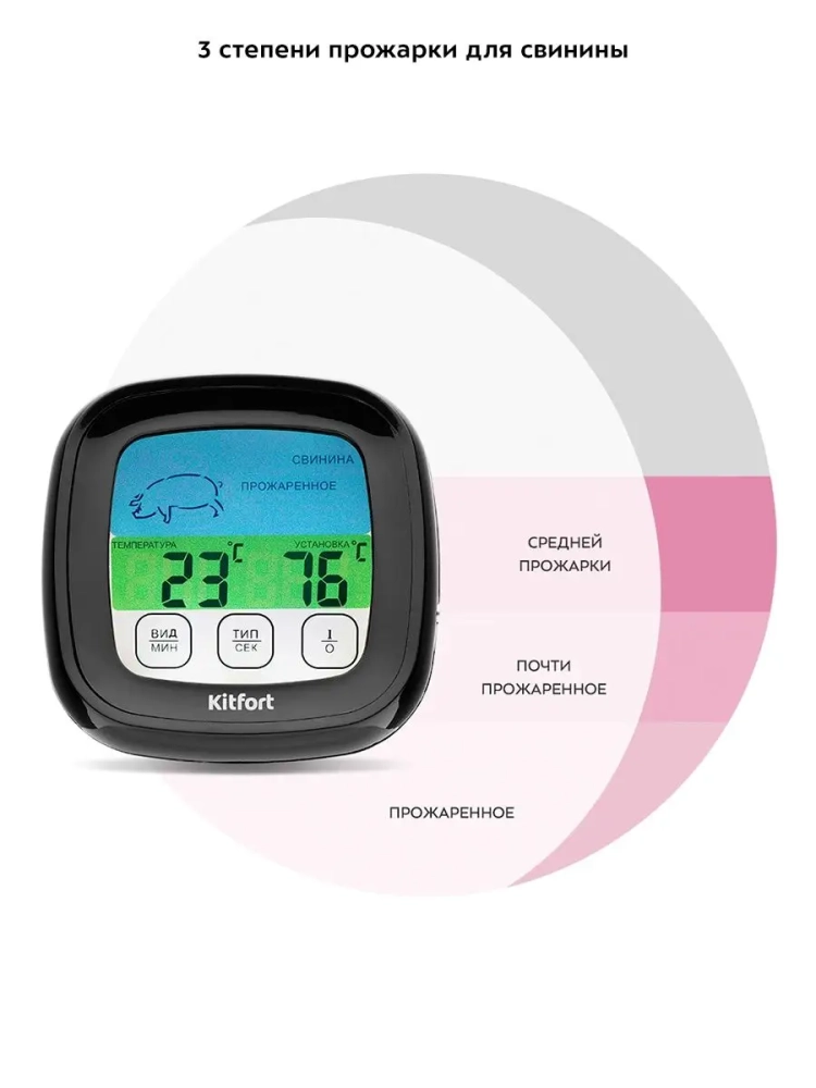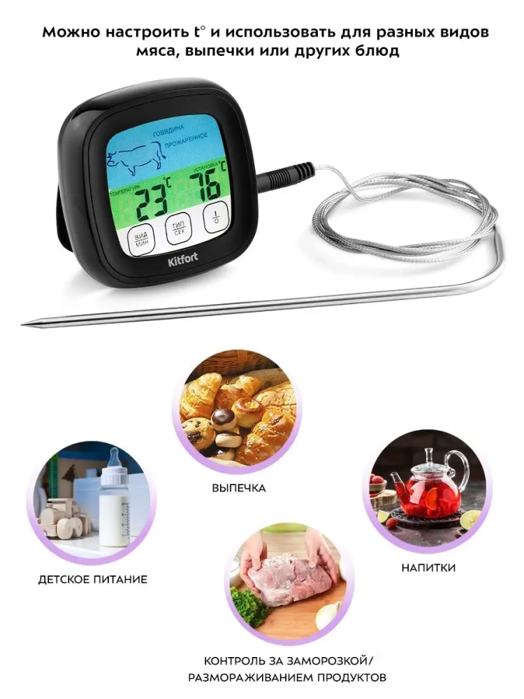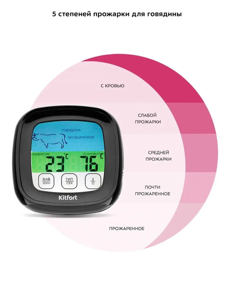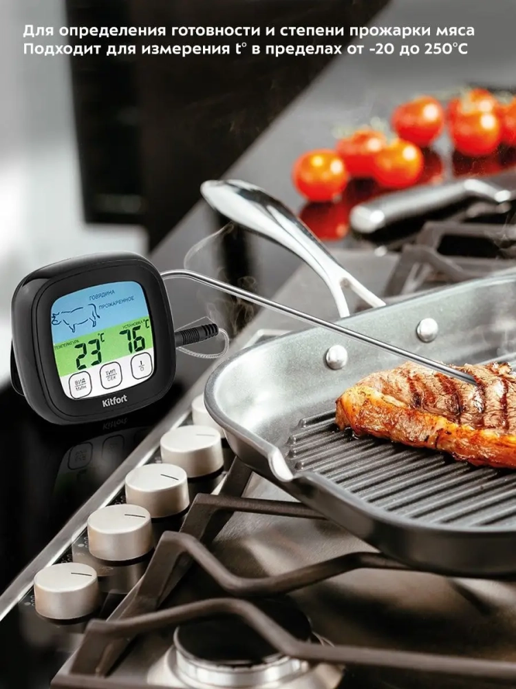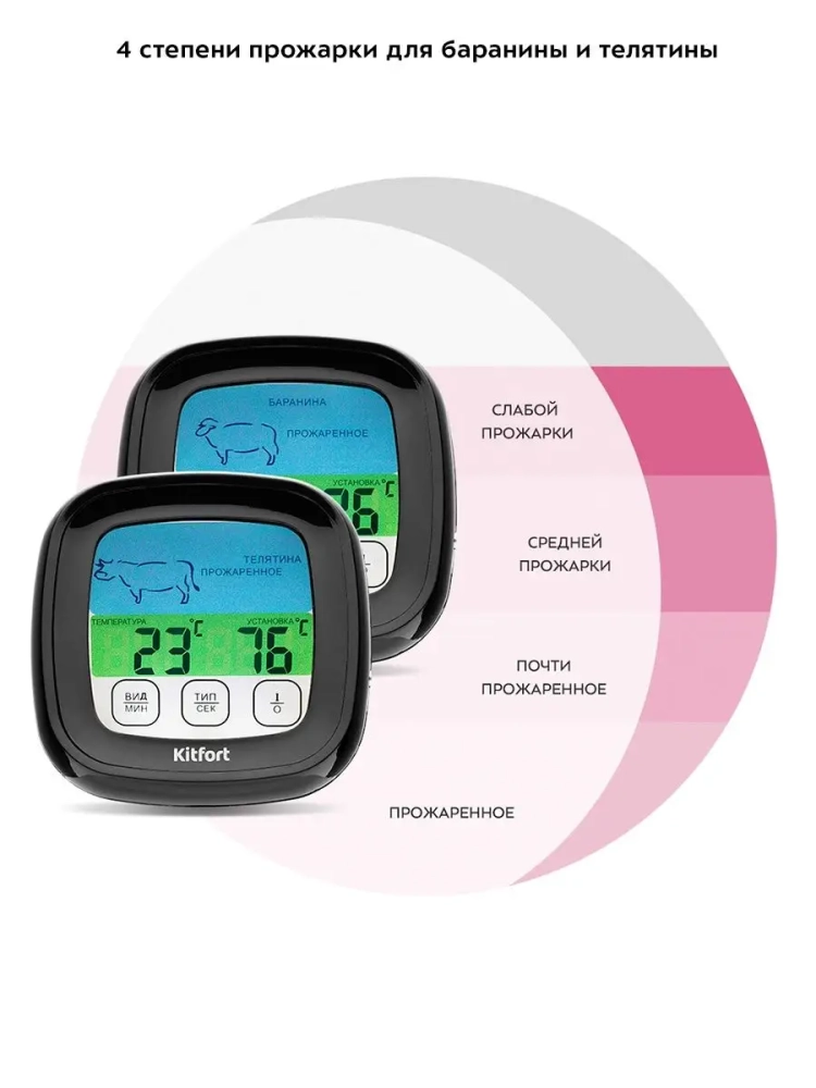 Термометр для мяса Kitfort KT-2066 предназначен для определения готовности и степени прожарки мяса. Ценители стейков смогут точно определить степень прожарки и вовремя закончить термическую обработку мяса. Обычно рекомендуют определять прожарку стейка по секундомеру или «на ощупь» (по текстуре мяса). Однако ни один из этих способов не гарантирует точного результата. Единственный точный способ определить степень прожарки стейка — измерить температуру в центре стейка. Для этого служит специальный прибор — термометр для мяса, к которому подключается термощуп.