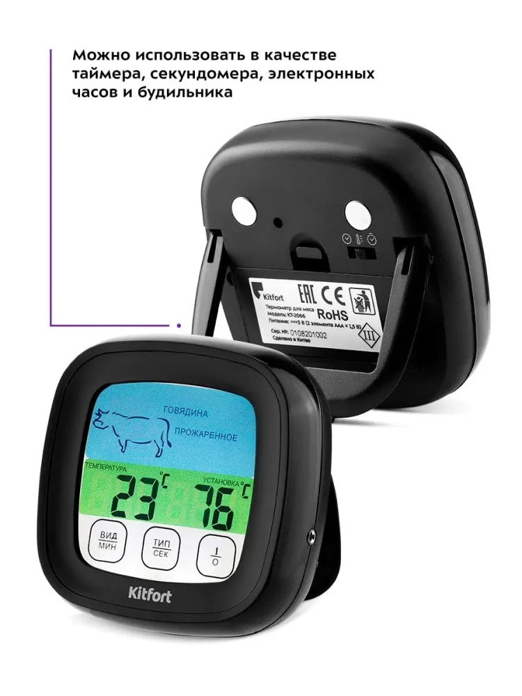 Также термометр для мяса KT-2066 можно использовать в качестве таймера, секундомера, электронных часов и будильника. Устройство питается от двух батареек типа ААA (в комплект не входят), поэтому вы можете свободно перемещать его и устанавливать вблизи места приготовления мяса. На обратной стороне корпуса есть подставка и 2 магнита, чтобы поставить термометр для мяса на поверхность или повесить на духовку или холодильник.