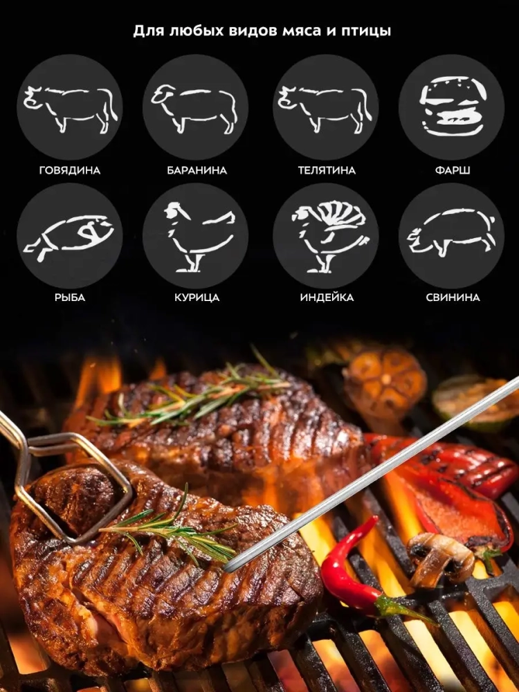 В термометре для мяса вы можете выбрать вид мяса: говядина, баранина, телятина, фарш, свинина, индейка, курица или рыба. Таким образом термометр можно использовать не только с предустановленными настройками или не только для разных видов мяса, но и для выпечки или других блюд.