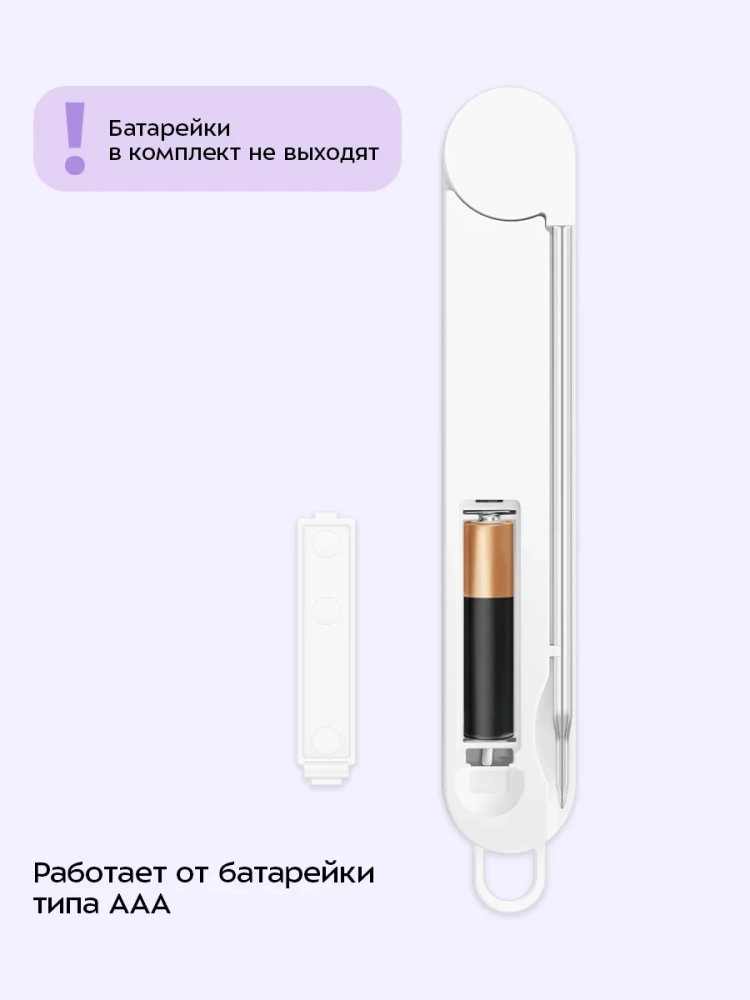 Устройство питается от одной батарейки типа ААА х 1,5 В (в комплект не входит), поэтому вы можете свободно перемещать его. Щуп у термометра сделан складным, так прибор не будет занимать много места на кухне. У устройства есть пластиковая петля, чтобы повесить кулинарный термометр на крючок.