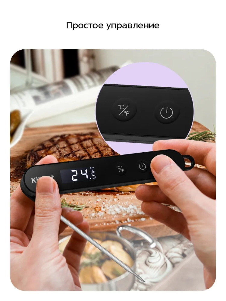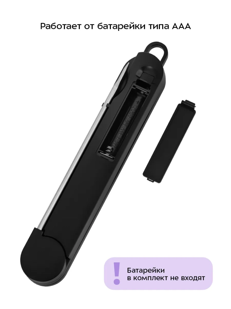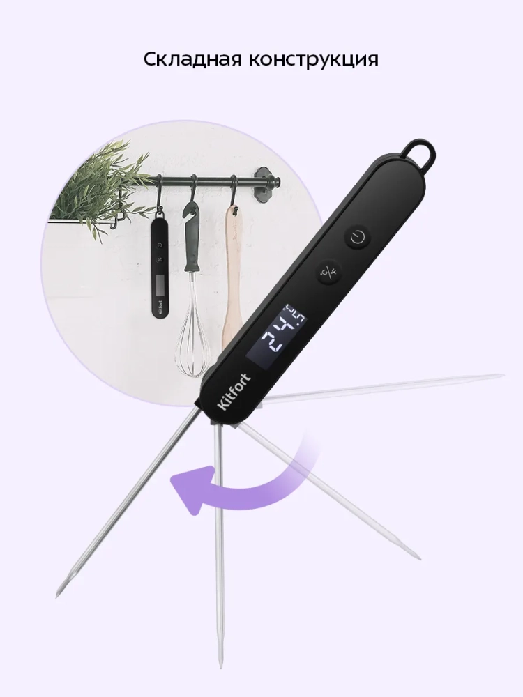 Устройство питается от одной батарейки типа ААА х 1,5 В (в комплект не входит), поэтому вы можете свободно перемещать его. Щуп у термометра сделан складным — так прибор не будет занимать много места на кухне. У устройства есть пластиковая петля, чтобы повесить кулинарный термометр на крючок.