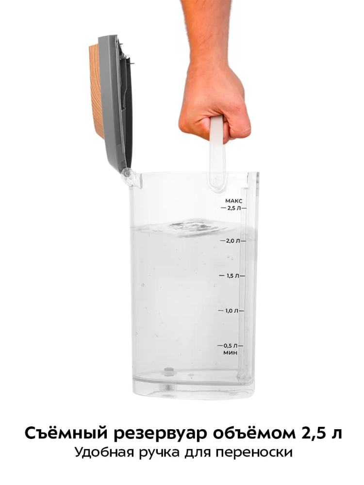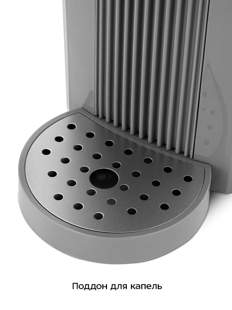 Съемный резервуар для воды оборудован удобной ручкой для переноски, которую можно снять при желании. Поддон с решеткой защищает поверхность, на которую установлен термопот, от капель воды. Присоски на дне делают прибор устойчивым.