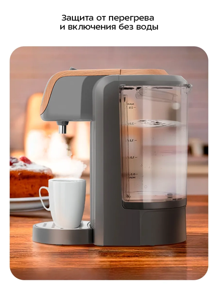Термопот имеет защиту от перегрева и от включения без воды. При включении без воды термопот подаст сигнал с помощью индикатора подачи воды, который загорится красным. При перегреве устройство выключается автоматически.