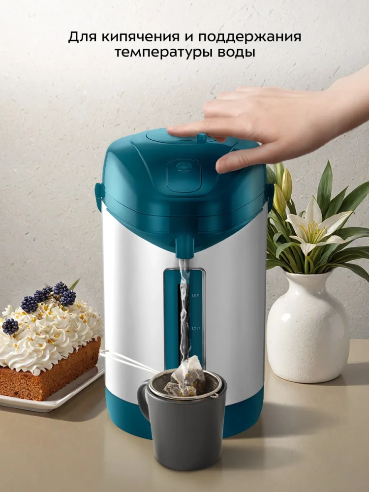 Термопотом можно пользоваться без подключения к сети. Вы можете использовать его для удобной подачи воды комнатной температуры или вскипятить воду в термопоте, когда он подключен к сети, затем отключить устройство от сети и установить термопот в месте, где нет доступа к электросети. Благодаря двойным стенкам резервуара вода в термопоте будет остывать достаточно медленно. Скорость понижения температуры в резервуаре зависит от температуры окружающей среды.