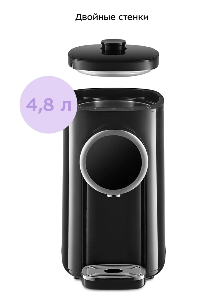 Контакты для подключения к сети расположены на задней стене устройства, что позволяет удобно разместить термопот на столе или прикрепить к стене. Водяной насос работает без использования батареек, что делает устройство более экологичным.