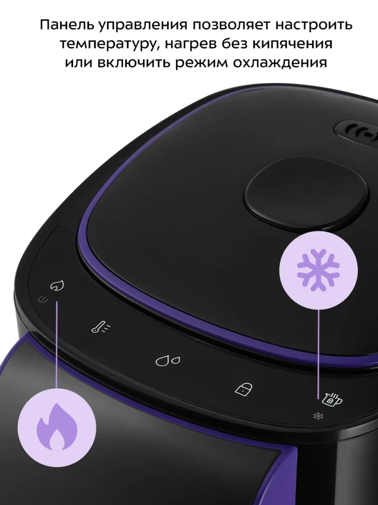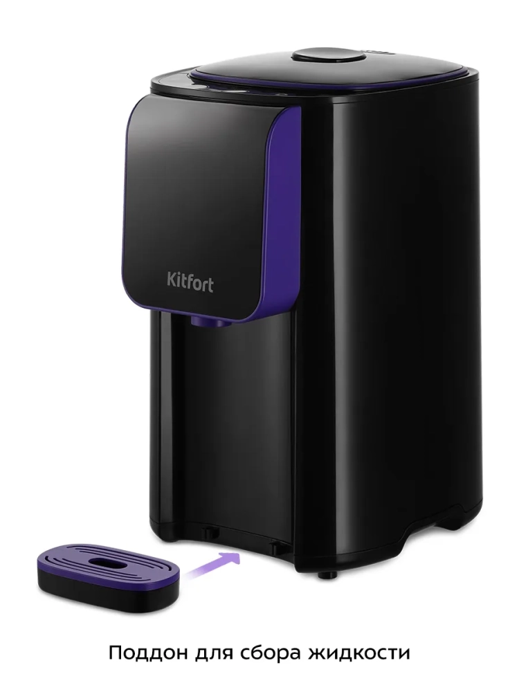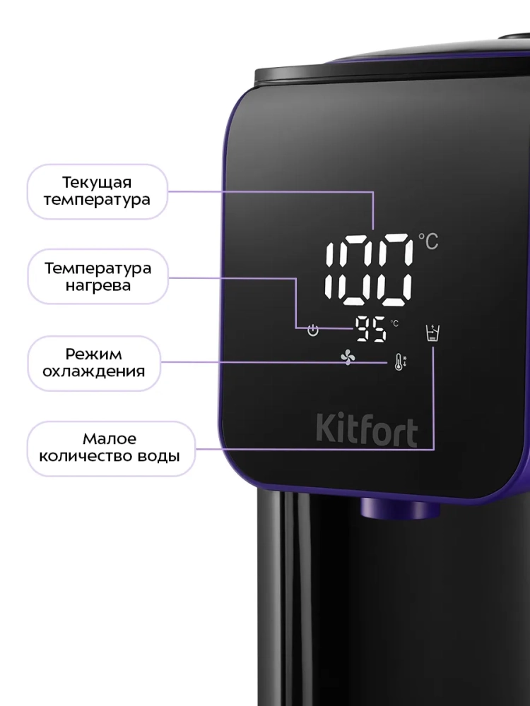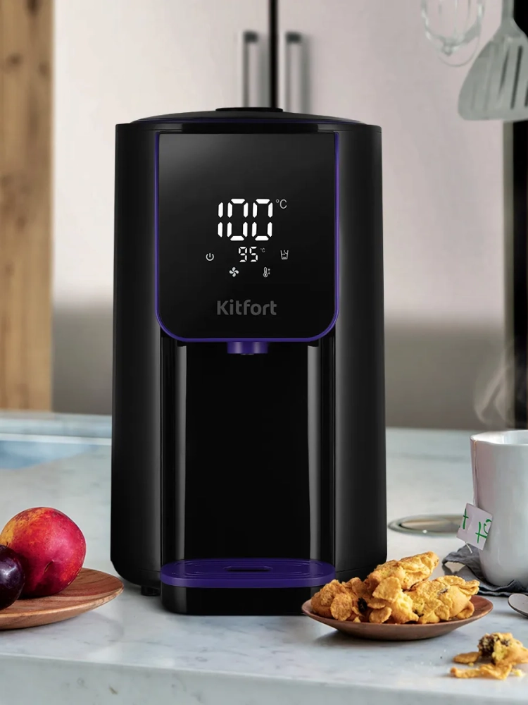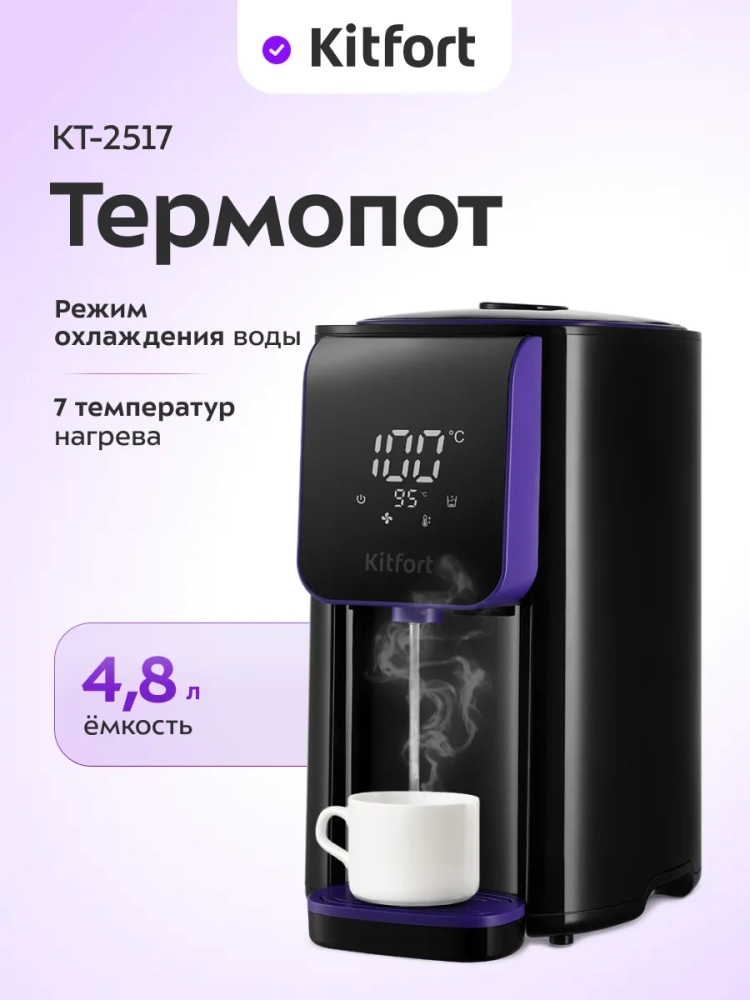 Термопот Kitfort КТ-2517 — это современный электрический термо прибор, который станет незаменимым помощником на вашей кухне. Этот термопод объемом 4.8 литра позволяет не только вскипятить воду, но и поддерживать её в горячем состоянии благодаря функции выбора температуры. Вы можете выбрать один из шести режимов нагрева: 45, 55, 65, 75, 85 или 95 °С. Это делает его идеальным для заваривания различных сортов чая и приготовления детского питания. Электрический термопот для подогрева оснащен скрытым нагревателем (ТЭН), что предотвращает образование накипи и снижает уровень шума при работе. Двойные стенки чайника подогревателя устройства помогают сохранить тепло дольше и экономить электроэнергию. Корпус выполнен из пластика с резервуаром из нержавеющей стали — вода не контактирует с пластиковыми частями прибора. Функция автоматической подачи воды упрощает использование: достаточно нажать кнопку для получения нужного объема жидкости в чашу или кружку. Встроенная блокировка кнопки подачи защищает от случайных ожогов и проливов кипятка на столешницу; она активируется через десять секунд бездействия. Если уровень воды в резервуаре становится критически низким, устройство оповестит вас об этом звуковым сигналом. Также предусмотрена защита от перегрева для безопасной эксплуатации техники а также насос. Вентилятор внутри термопота китфорт ускоряет охлаждение до заданной температуры в режиме охлаждения электроприбора — это удобно при приготовлении напитков в термочайнике с дисплеем требующих поддержания более низкой температуры воды.