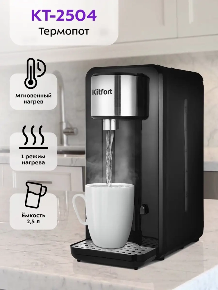 Электрические чайники и термопоты Kitfort отличаются высоким качеством и надежностью. Этот термопод станет отличным дополнением к вашей кухонной технике, включая аэрогриль и кофеварку. Бытовая техника Kitfort — это гарантия качества и долговечности. Купить термопот Kitfort КТ-2504 — значит сделать выбор в пользу удобства и функциональности.