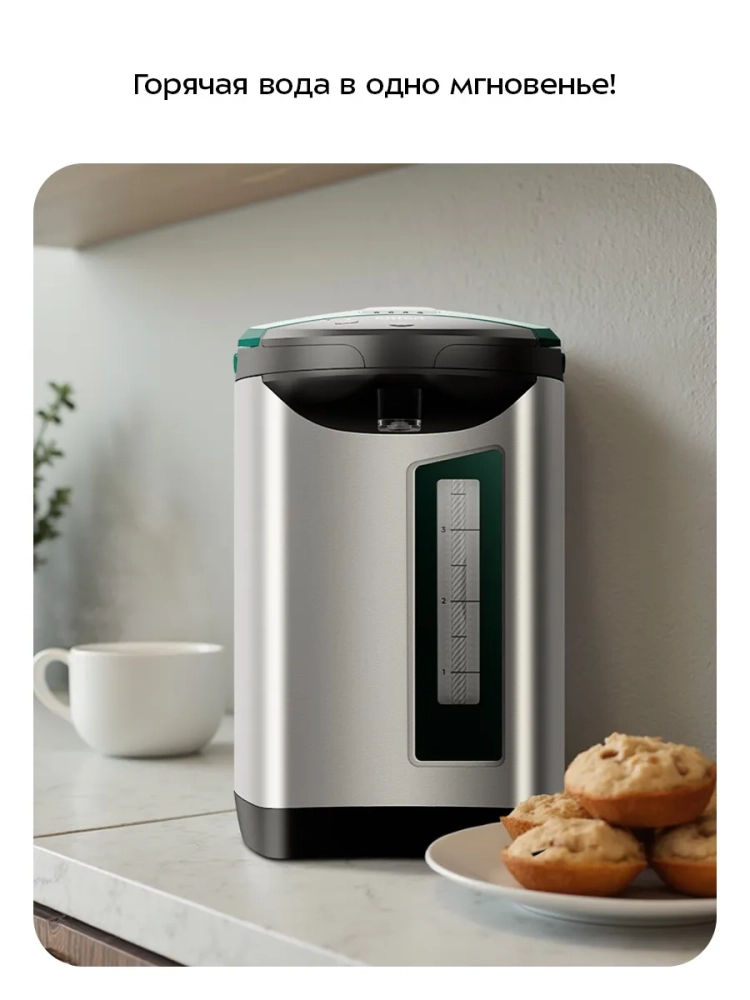 Двойные стенки термопота помогают сохранить тепло и реже включать нагрев, что поможет сэкономить на электроэнергии. Корпус термопота состоит из пластика и нержавеющей стали, а резервуар — из нержавеющей стали. Внутренняя часть крышки также сделана из нержавеющей стали, поэтому вода не соприкасается с пластиковыми частями устройства.