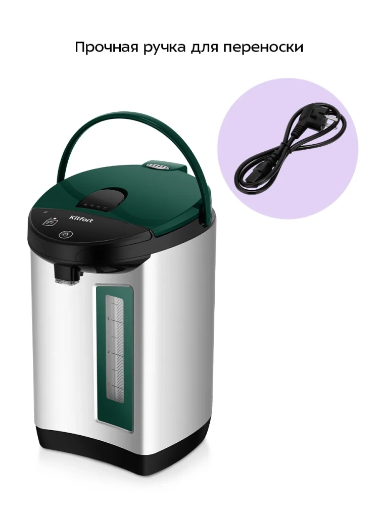 Термопот Kitfort КТ-2528 служит для кипячения воды и поддержания ее температуры с помощью периодического включения и отключения нагрева. Отличие термопота от обычного чайника в том, что термопот поддерживает температуру воды, поэтому она может оставаться горячей долгое время, если вам это необходимо.