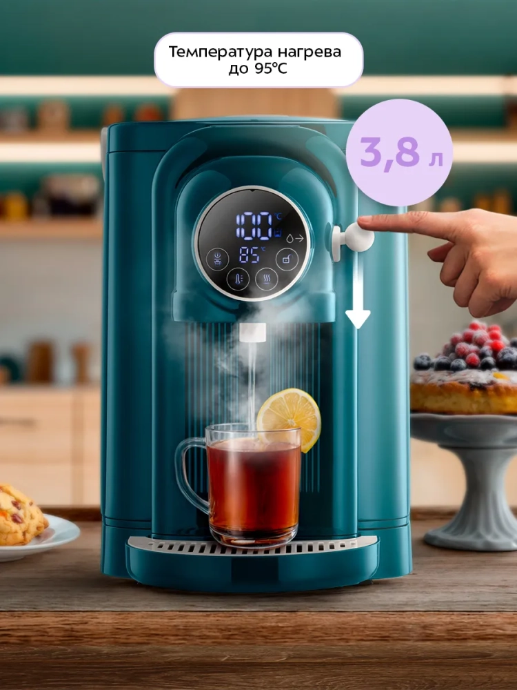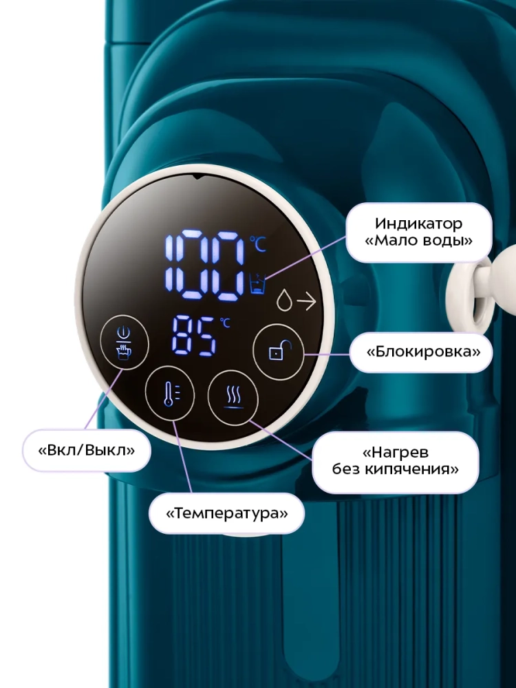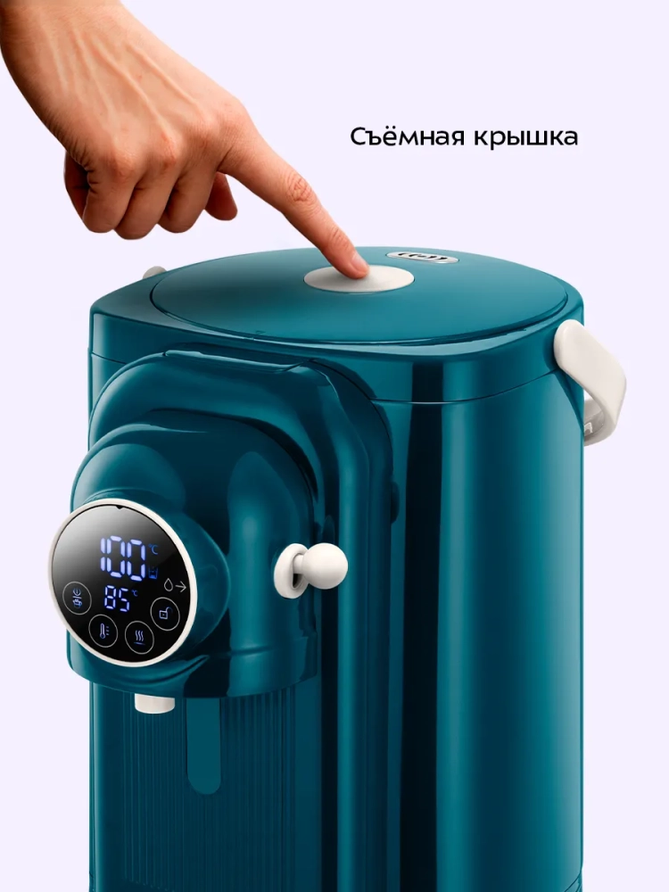 Термопот оснащен функцией выбора температуры. Он может не только вскипятить воду, но и нагреть ее до температуры 45, 55, 65, 75, 85 или 95 °С, что очень удобно при заваривании различных сортов чая, приготовлении кофе и детского питания.