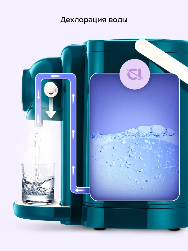 Термопот доводит воду до кипения и включает продолжительное кипячение для уменьшения содержания растворенного в воде хлора.