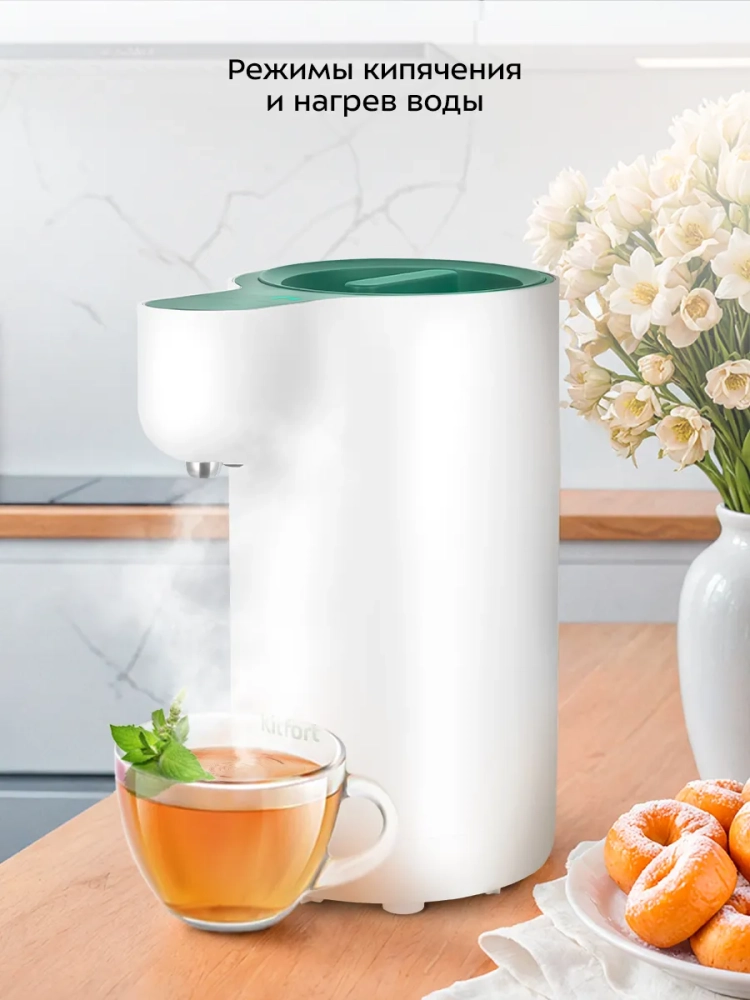 Термопот Kitfort КТ-2524 служит для кипячения и нагрева воды до заданной температуры, а также поддержания температуры воды с помощью периодического включения и отключения нагрева. Отличие термопота от обычного чайника в том, что термопот поддерживает заданную температуру воды, поэтому у вас всегда есть горячая вода. Также удобно наливать воду благодаря автоматической подаче воды.